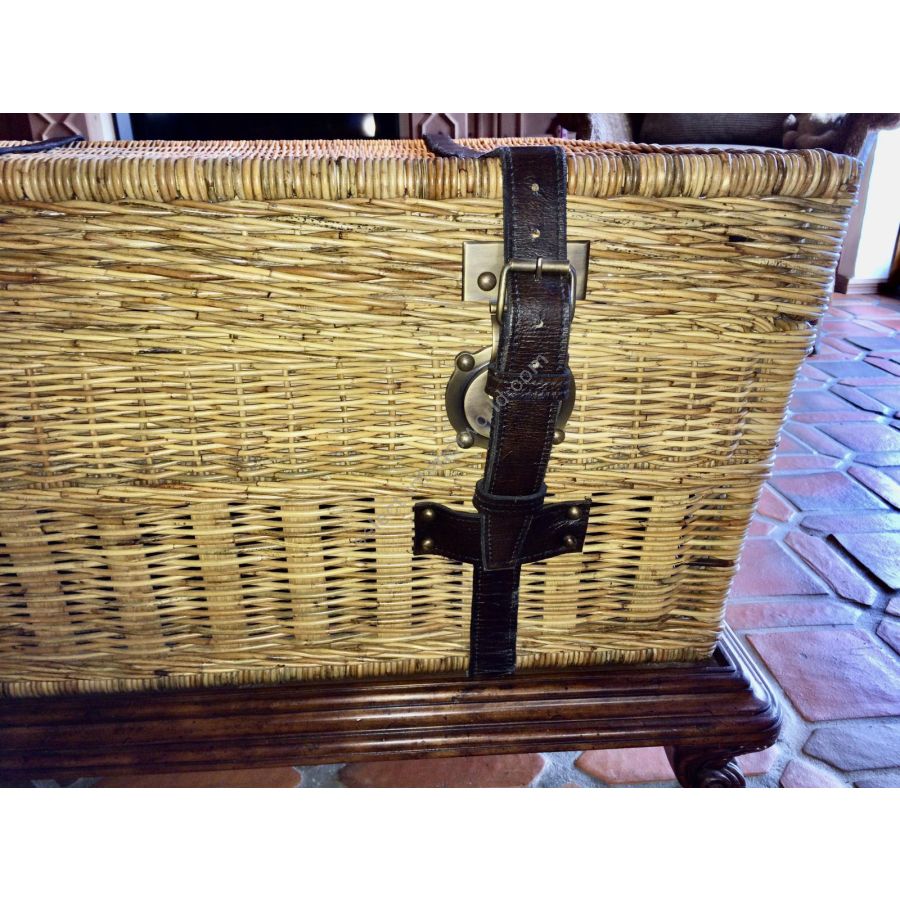 Der Couchtisch Marseilles von Ralph Lauren Home ist eine raffinierte Interpretation traditioneller Rattantruhen und verbindet handwerkliche Handwerkskunst mit luxuriösem Design. Handgeflochtenes Naturrattan umhüllt eine geräumige Truhe, elegant akzentuiert durch Lederriemen und montiert auf einem edlen Holzsockel.