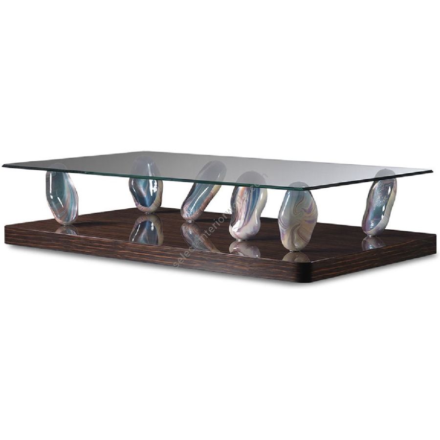 Couchtisch mit Holzgestell in glänzendem Ebenholz oder glänzend lackiert in den Farben Standard oder Venezia. Beine aus Muranoglas in Calcedonio oder Bernstein. Platte aus extraklarem Glas, 12 mm stark, mit 45°-Fase und abgerundeten Ecken (R50 mm).