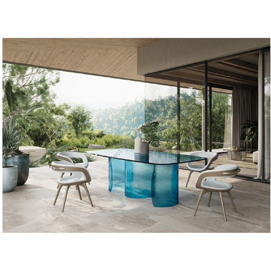 Esstisch mit Basis und Platte aus Acqua-Glas, erhältlich in den Farben Rauch, Transparent, Bernstein, Blau und Smaragd.