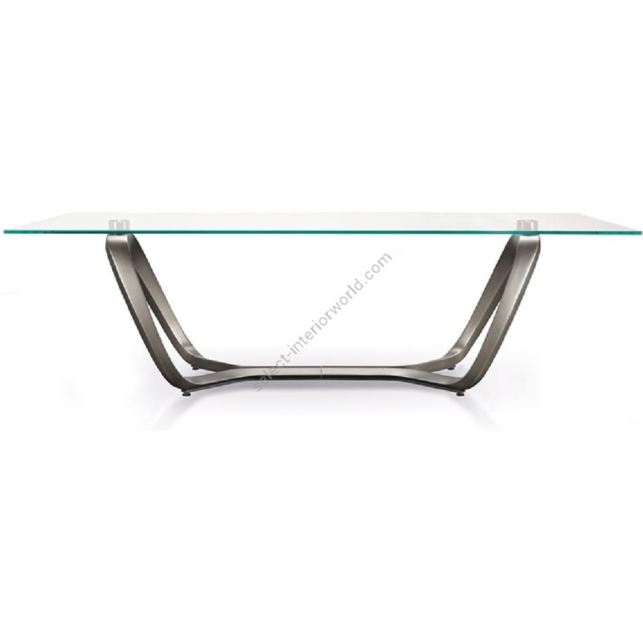 Esstisch mit Untergestell aus Verbundmaterial in Bronze, satiniertem Messing oder Titan. Tischplatte aus transparentem oder extrahellem Glas oder Marmorreflex/Legnoreflex.