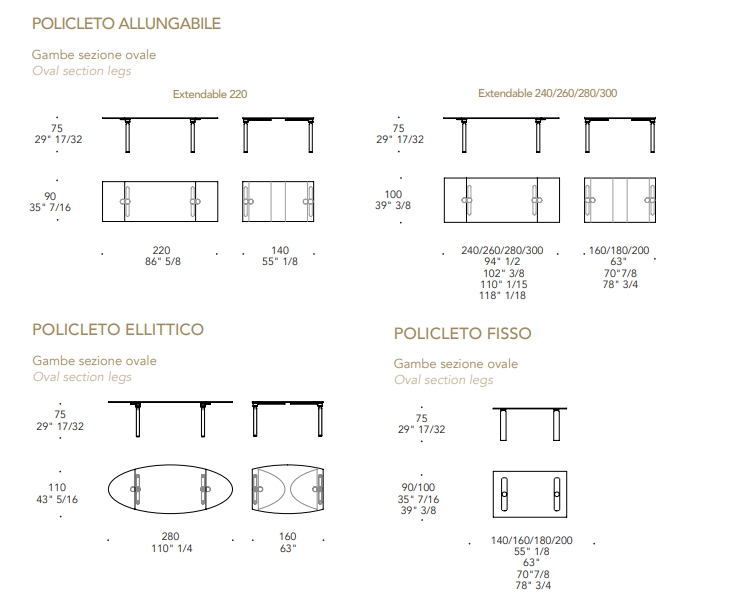 Sonderedition zur Feier des 30. Jubiläums des ikonischen Tischdesigns Policleto. Die Beine haben einen ovalen Querschnitt mit lackierter Oberfläche und sind nicht in den Farben Weinrot, Korallenrot, Eisengrau, Stahlblau oder Blaugrün erhältlich. Optionale transparente Wasserglasplatte.