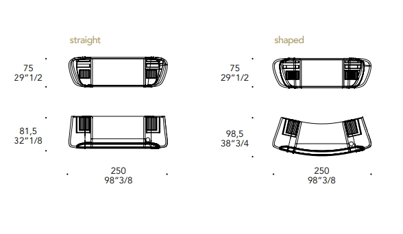 Schreibtisch mit gebogener Struktur, erhältlich in satiniertem Messing, dunklem Messing, Titan oder Kupfer oder glänzend lackiert in den Farben Venezia. Vorderteil mit Leder bezogen. Platte mit Leder oder in der gleichen Ausführung wie die Struktur mit Kabelloch bezogen. Ausgestattet mit 2 Schubladen und 2 Aktenschubladen