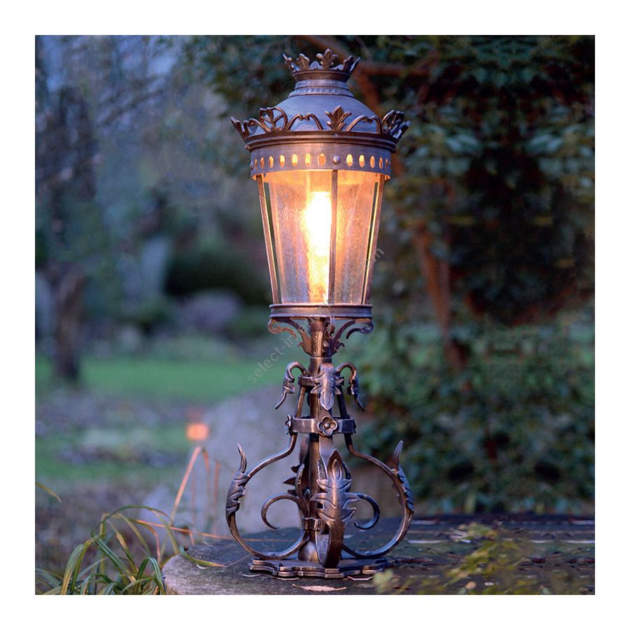 Dieses exklusive Design der Sockelleuchte gehört den Robers (Deutschland), die dafür bekannt sind, ihre Leuchten manuell aus Eisen, Kupfer und Stahl herzustellen und die Produkte so zu verarbeiten, dass sie für Nachhaltigkeit und Wasser- / Seebeständigkeit sorgen. Diese schöne Sockelleuchte ist eine Verkörperung der Liebe zu den Blumen. Die traditionelle zylindrische Säule ist mit Eisenstielen und Blütenblättern verziert, die den Schatten in Laternenform mit einem von den Blumen reich verzierten Dach tragen. Die gesamte Leuchte besteht aus Schmiedeeisen und ist in 10 Ausführungen erhältlich.