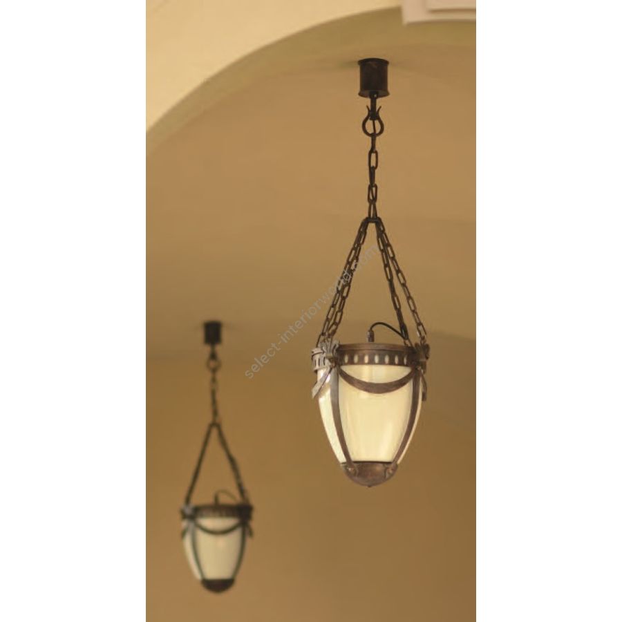 Diese elegante Hängeleuchte gehört zur Outdoor-Kollektion der deutschen Marke Robers, deren Leuchten vollständig aus Schmiedeeisen gefertigt sind. Dieses Design ist eine Kombination aus klassischen und gotischen Stilen und schafft eine außergewöhnliche Lösung. Sein Lampenschirm aus geblasenem Glas in Opaloptik ist mit verschiedenen Arten von Ketten an der Decke befestigt: Vier von ihnen tragen den Lampenschirm, der gleichmäßig um seinen Durchmesser angeordnet ist, während der obere Schirm als Sockel für sie dient und die Hängelampe an der Decke befestigt ist. Die Scheiben werden von den flachen vertikalen Stangen und einem breiten horizontalen Riemen eingerahmt - alles zusammen erinnern sie an einen mittelalterlichen Helm. Die einzige Dekoration sind die Blumenmotive, die die Nieten bedecken.