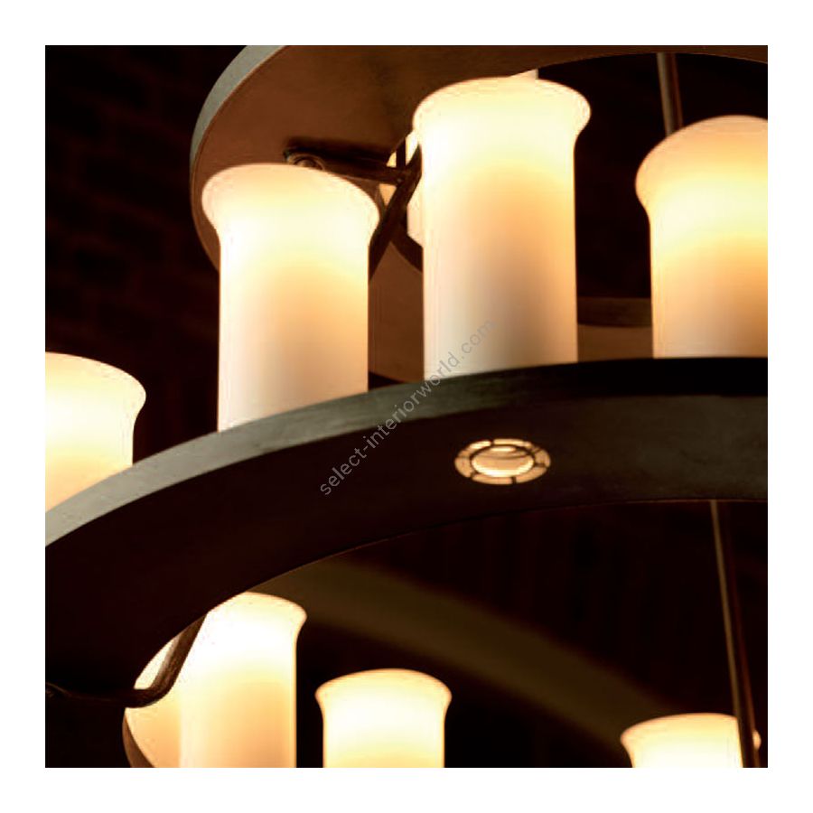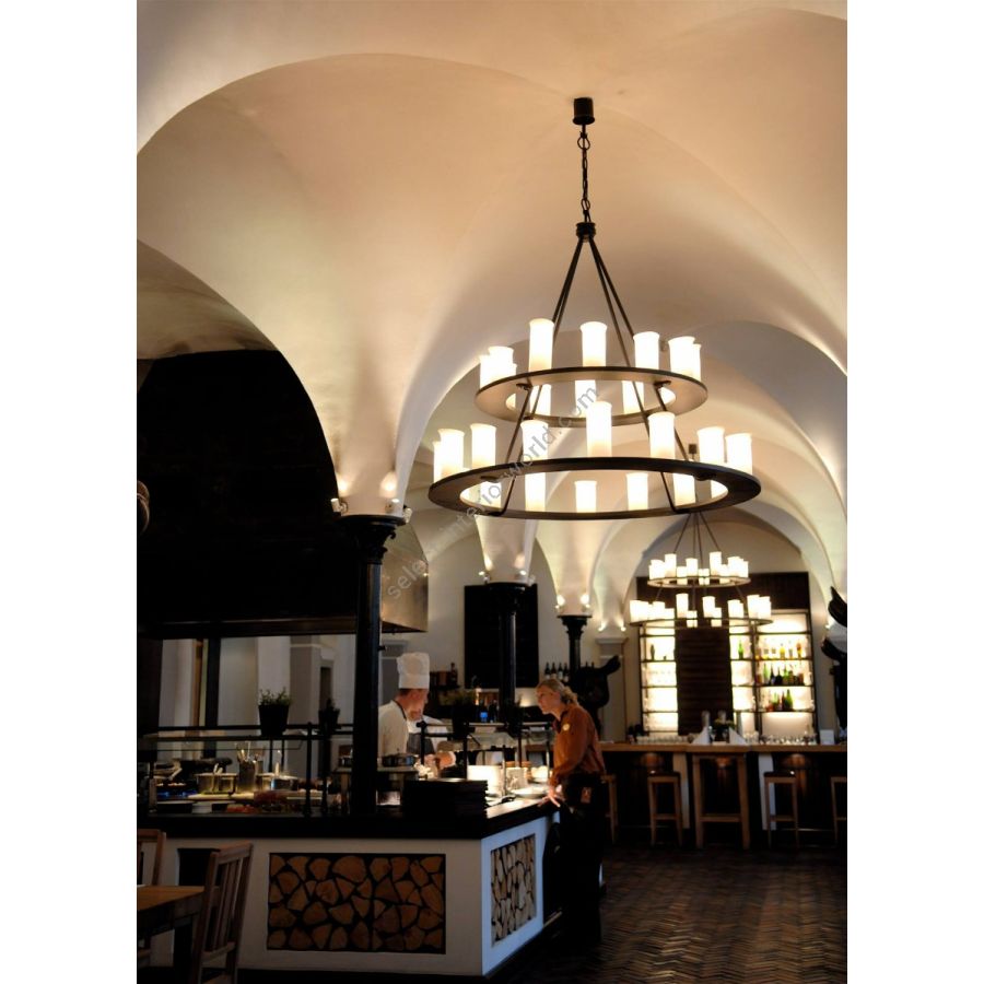 Diese riesige 2-Lagen-Hängeleuchte aus der Kollektion „Indoor 2“ von Robers (Deutschland) ist eine elegante Lösung aus Hartstahl und Glas. Die untere Schicht enthält 8 Glühbirnen + 8 Glühbirnen und 3 Downlights, die obere Schicht - 5 Glühbirnen. Jede Glühbirne ist mit einem Glaslampenschirm in opalmattem Finish abgedeckt, unterscheidet sich jedoch durch die Größe. Der Boden, die Schläuche, der Baldachin und die Ketten sind alle aus Stahl handgefertigt. Die Designer bieten 10 Optionen für das Finish: von der klassischen Patina und dem antiken Messing bis zum alten Schwarz und Silber. Die Oberflächen werden ebenfalls von Hand gefertigt. Aus diesem Grund kann sich die endgültige Lösung vom Foto unterscheiden.