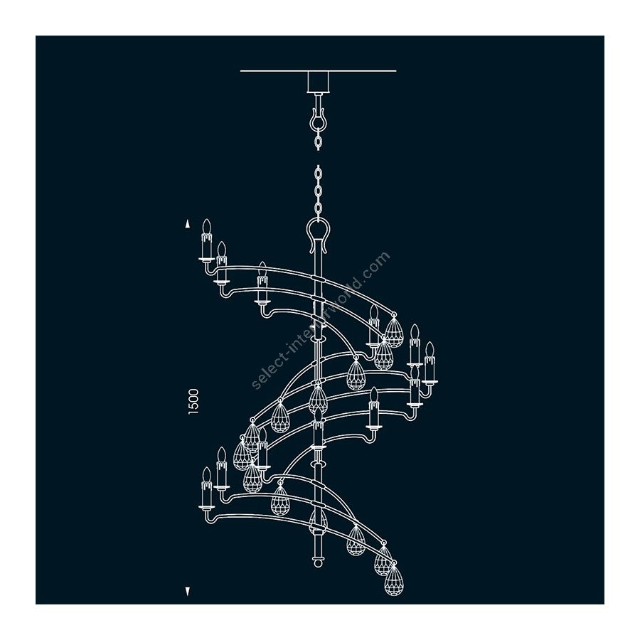 Diese Hängeleuchte aus der Kollektion „Indoor 3“ der deutschen Marke Robers hat ein außergewöhnliches Design, das an ein elegantes Notenfach erinnert. Jeder Arm enthält auf der einen Seite Lampenschirme und auf der anderen Seite Kristalle. Eine solche Lösung bringt Gleichgewicht und Harmonie. Jeder Kristall wird von Hand aus dem Felsen geschnitten. Es kann einige Mängel enthalten, die ein Zeichen seiner natürlichen Herkunft sind, daher gehört das Produkt zur High-End-Nische. Der Boden, der Schlauch, die Arme, die Kerzenbecher - alle sind manuell aus Eisen gefertigt. Das untere Endstück und andere dekorative Elemente sind ebenfalls handgefertigt. Die Hängelampe ist durch die ebenfalls aus Eisen gefertigte Schlaufe und Kette mit dem Baldachin verbunden.