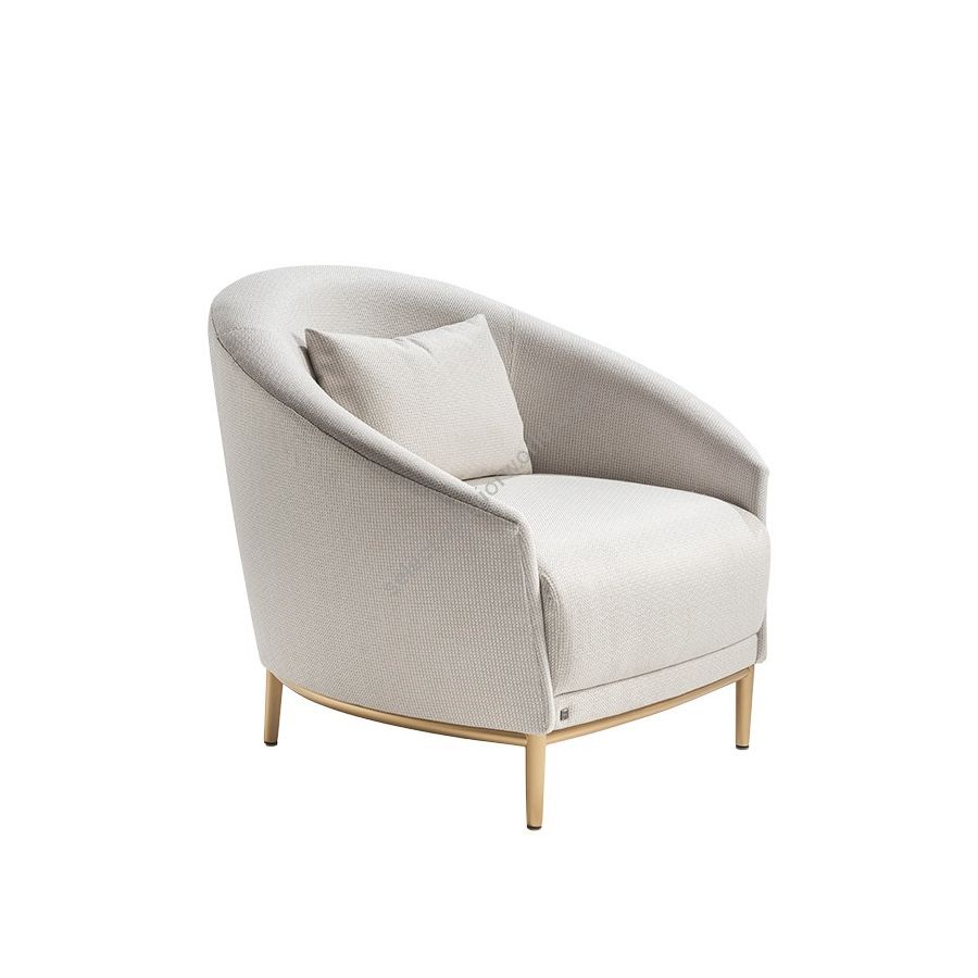 Das geschwungene Design ist eines der Hauptmerkmale dieses Polsterstuhls. Die charakteristischen Elemente dieses Stücks sind die geschwungene, halbrunde Form der Armlehne und das Design des Metallgestells, das exklusiv für diese Kollektion in der Ausführung Gold Rumba erhältlich ist. Das weiche Lendenkissen unterstreicht die reine und einhüllende Linie dieses Polsterstuhls.