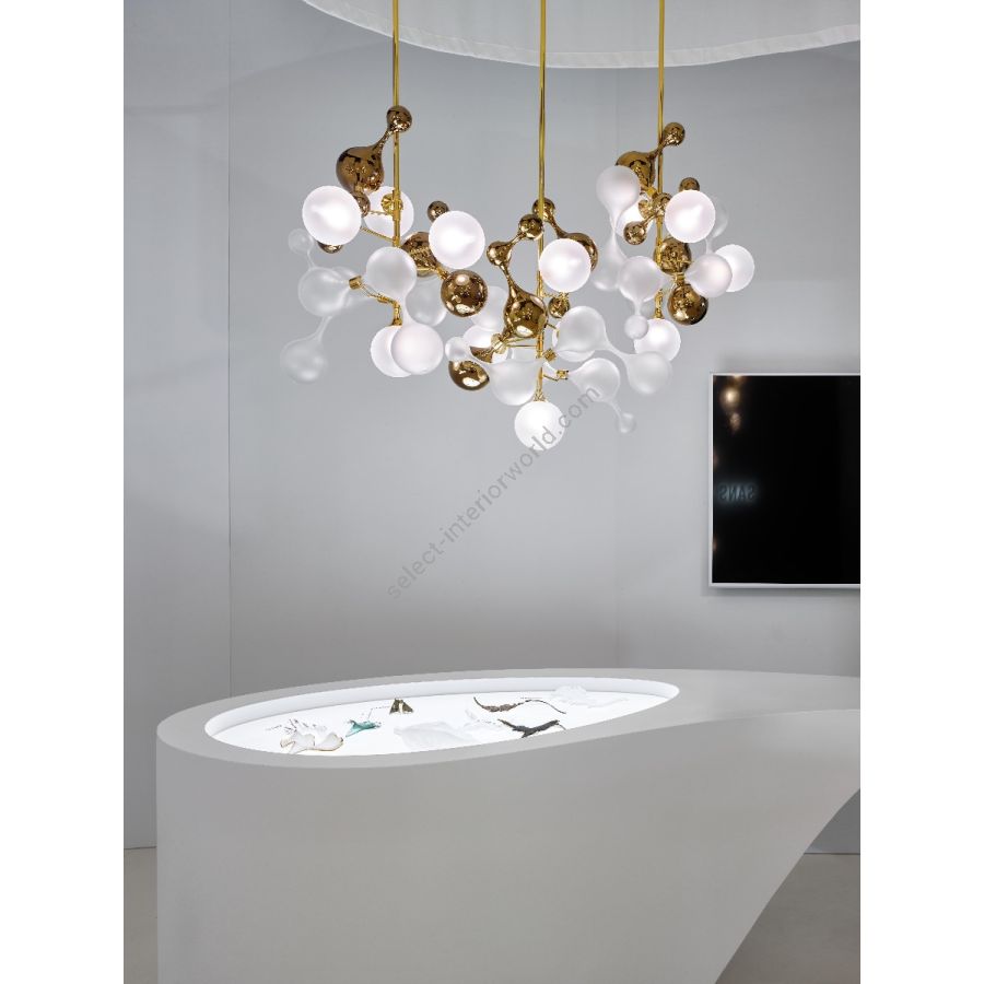 The PARTICLES collection features magnificent chandeliers formed of interconnecting complex glass shapes inspired by the microscopic design of powerful joy hormones – serotonin, dopamine and adrenaline. The glass components are finished in crystal, sandblasted and aurum nanocoating and fitted around a polished brass stem, to create bold artistic centrepiece for your space.