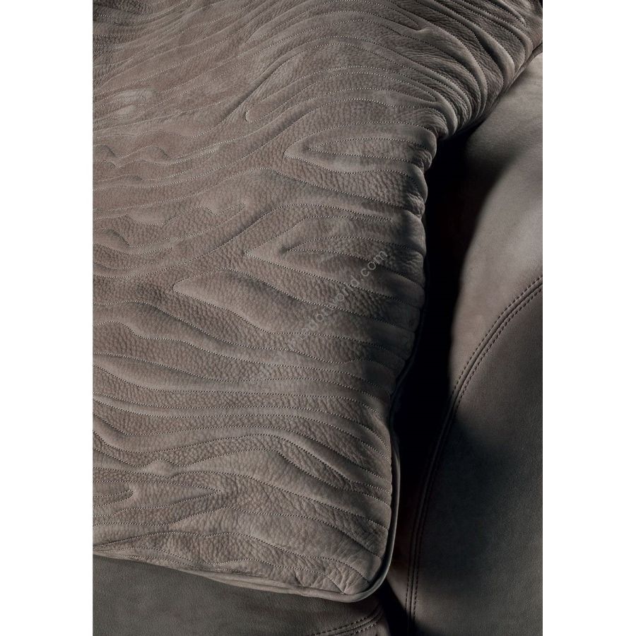 Sofa aus Elementen mit schlichten Linien, ideal für lineare oder halbeckige Kompositionen. Die offenen Arm- und Rückenlehnen sind mit einer verchromten Metallplatte versehen, die die Rundungen der Elemente betont. Diese Platte ist in den Ausführungen Kupfer schattiert, Braun schattiert hell, Schwarz Roségold, Hellgold hell, Champagnergold, Chrom glänzend, Schwarzchrom glänzend und Bronze matt satiniert erhältlich. Komfort steht bei diesem Möbel an erster Stelle. Spezielle Polyurethan-Schäume wurden miteinander vermischt, um Weichheit, Elastizität und Druckfestigkeit zu gewährleisten. Die Sitzfläche wird von speziellen elastischen PVC-Lamellen getragen, die wiederum von einer massiven Holzstruktur getragen werden. Besonderes Merkmal ist das exklusive gesteppte „Groove“-Dekor, das auf Wunsch die Vorderseite der Elemente zieren kann. Die handgefertigte Verarbeitung verleiht dem Produkt einen dreidimensionalen Effekt und unterstreicht seine exklusive Originalität. Eine Reihe von Zierkissen in verschiedenen Größen und Ausführungen rundet die Kollektion ab. Aufgrund der besonderen Zusammensetzung des Produkts ist der Bezug nicht abziehbar.