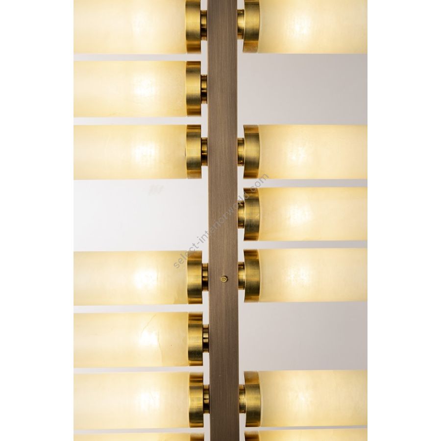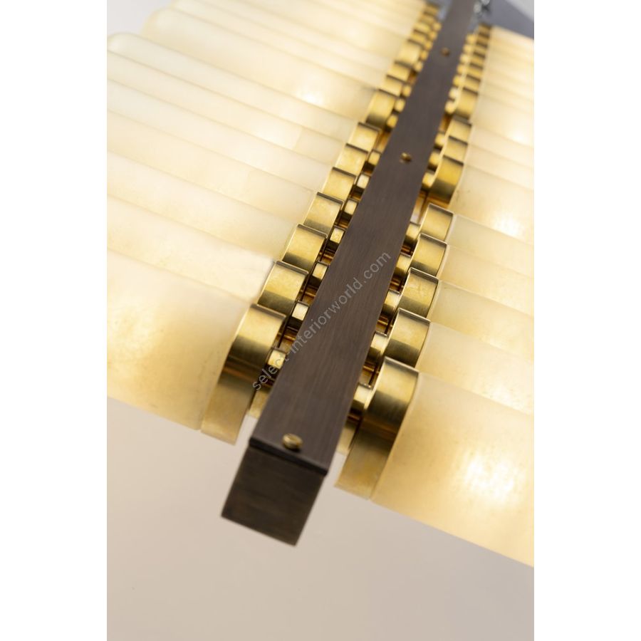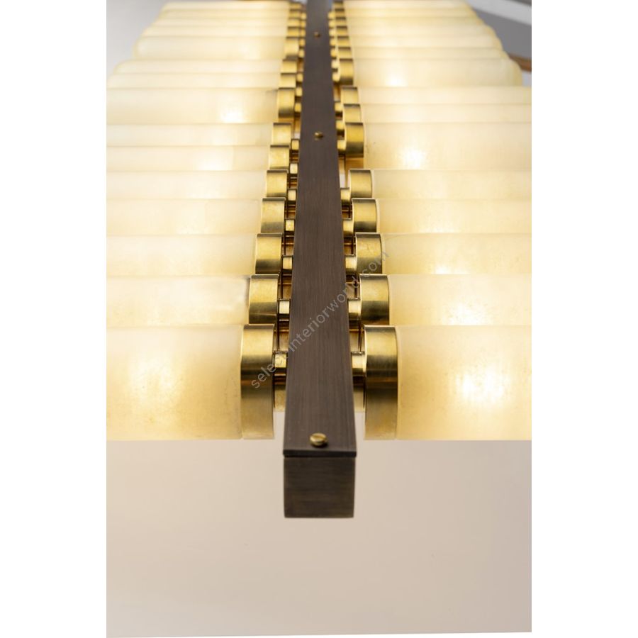 Chandelier vertical shape in burnished brass and details in natural brass with alabaster