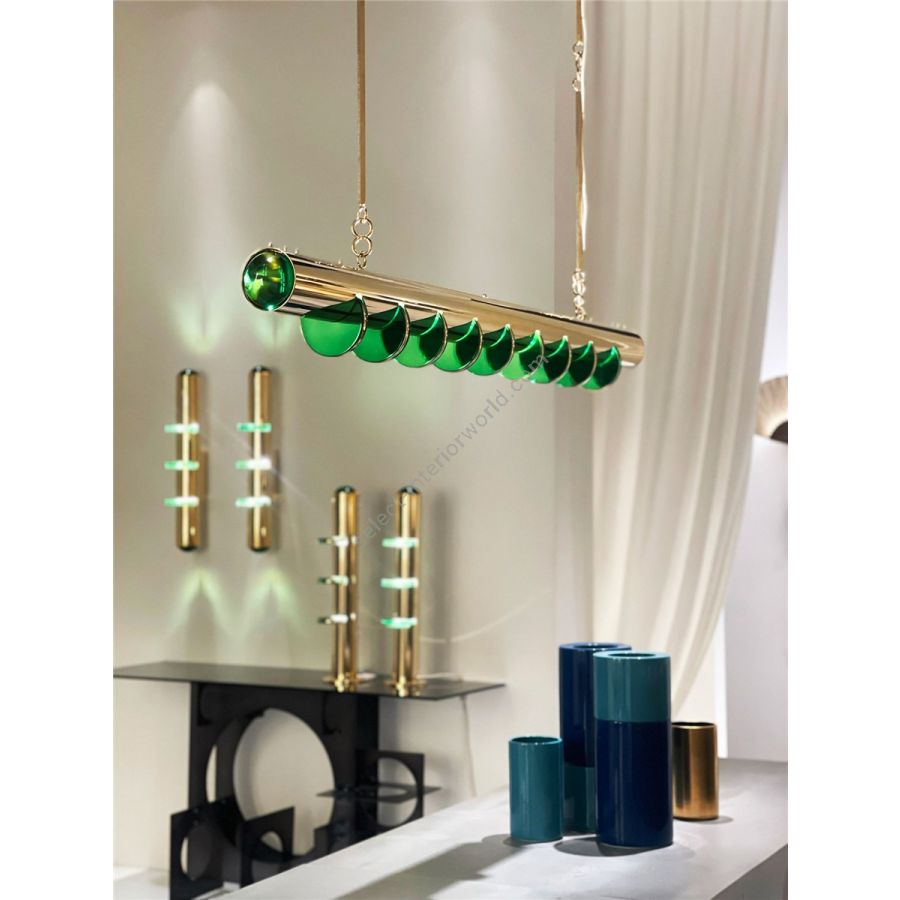 Chandelier in gilded brass and with crystal in green jade