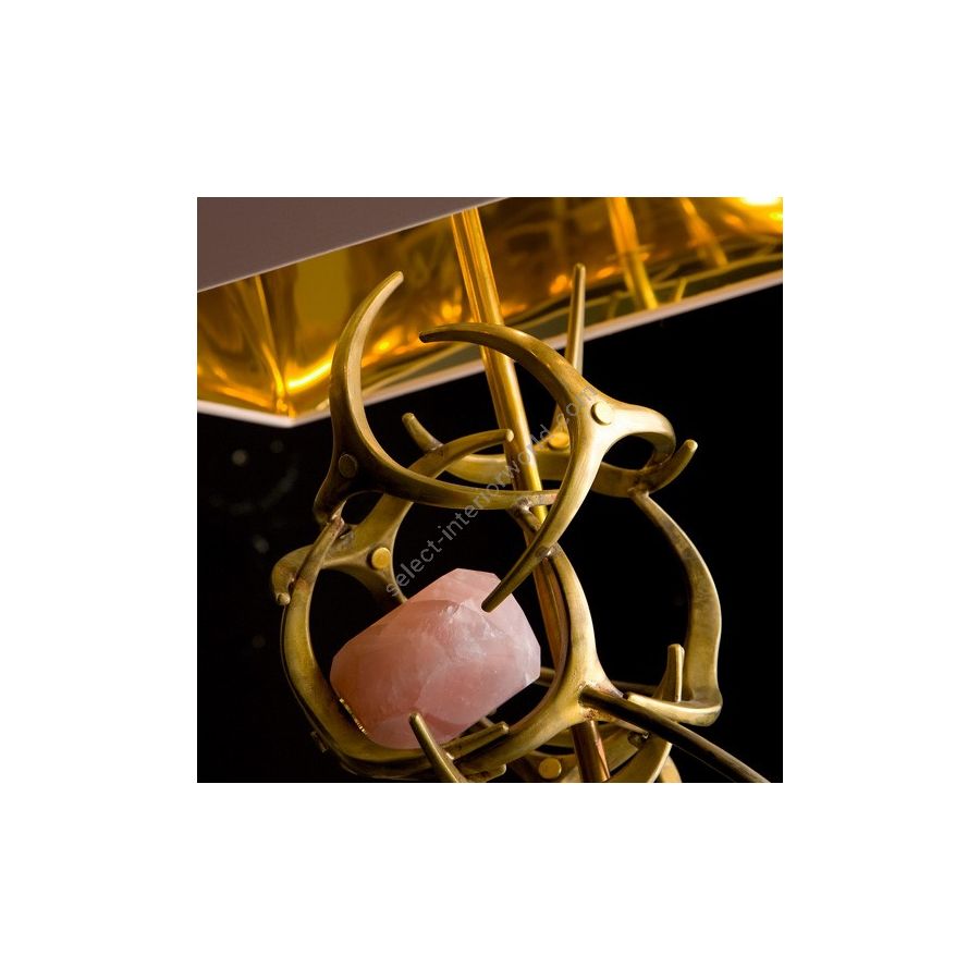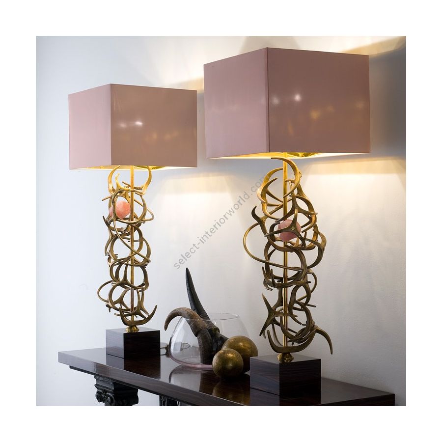 Lamp in hand soldered bronze with natural finish. Pink quartz stone. Makassar ebony base. Pink silk lampshade with golden inside.