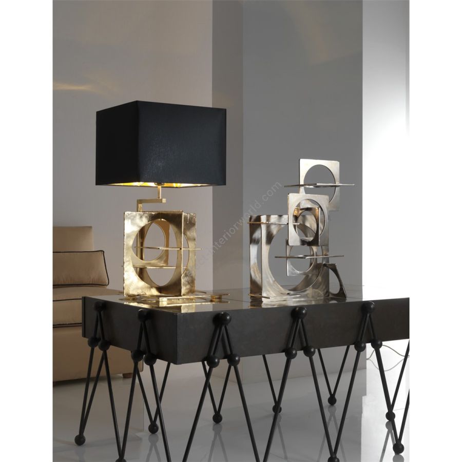 This table lamp was made with frosted iron sheets, engraved by hand and then carefully welded by hand to create a geometric sculpture. The finish is in coated gold giving it an aged effect. The peculiarity of this table lamp is its sculpture. The lampshade is in refined black Chintz with a gold foil inside. Suitable for both contemporary and classic environments, it presents in combination an object. The structure can also be made of coated nickel. In addition to living areas and studios, it can adorn rooms and fattening.
