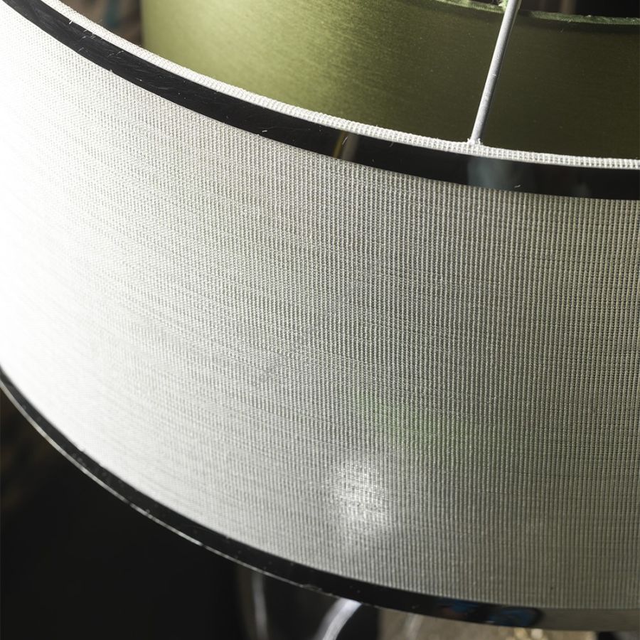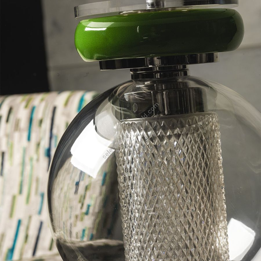 Crystal lamp composed with green majolica, nickel-plated brass and plexiglass. The double lampshade is double, outside in fabric woven silver and inside in green silk.