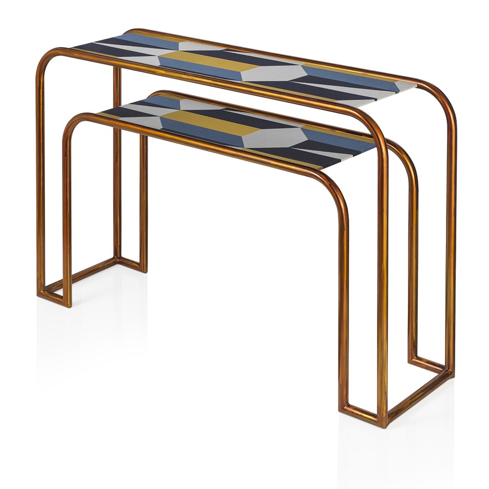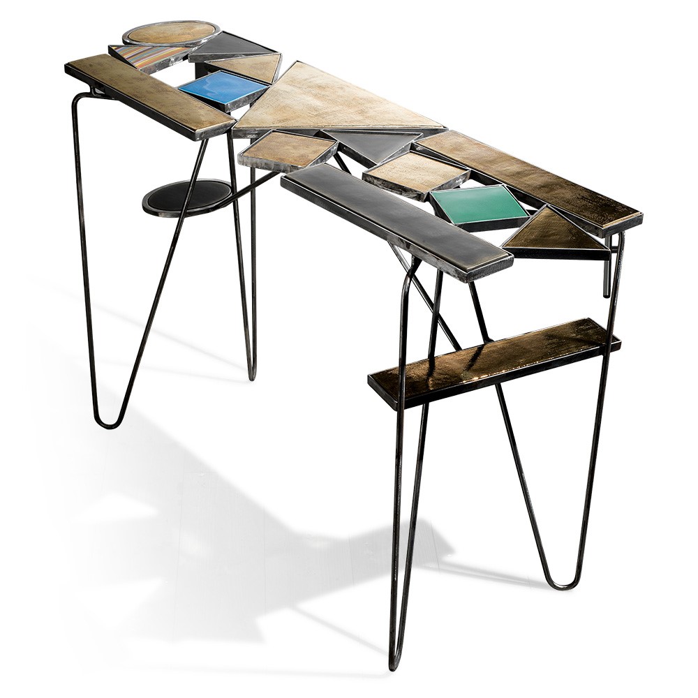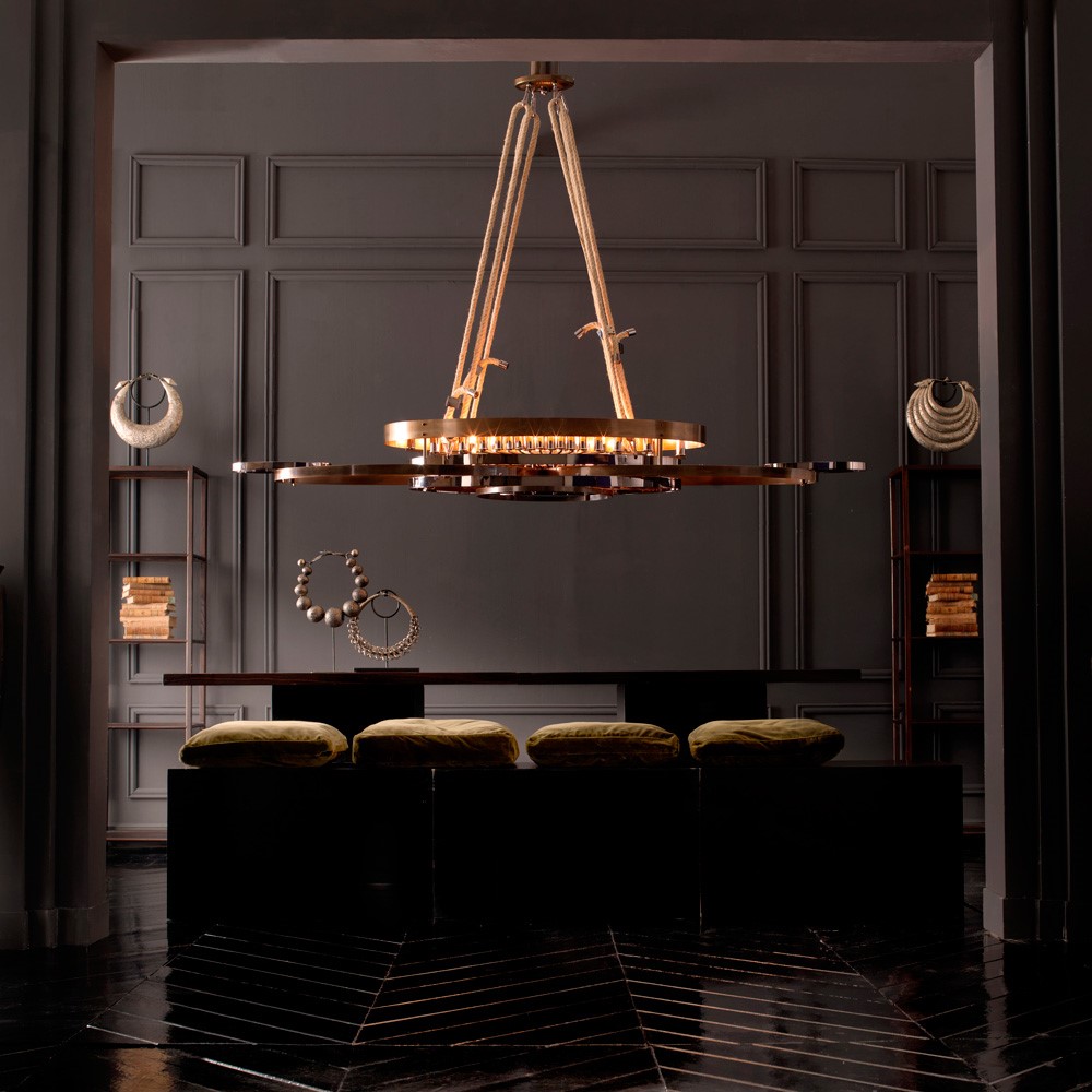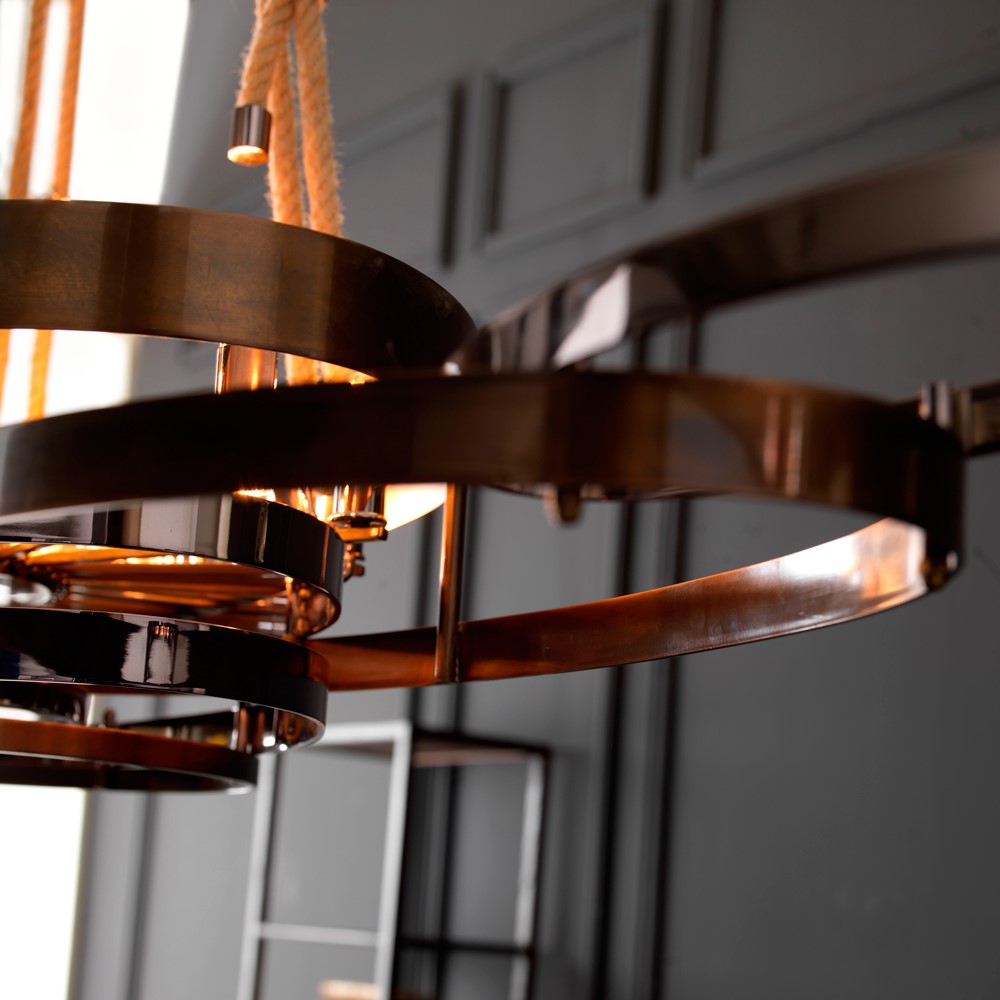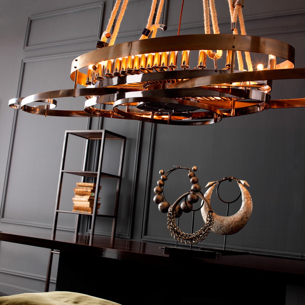 Brass chandelier made of ovals, entirely handmade. The finish is a mix of burnished and rose-colored fumé chrome. The chandelier is fixed to the ceiling with a natural, extensible rope.