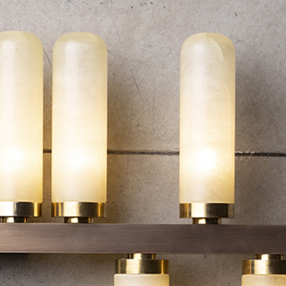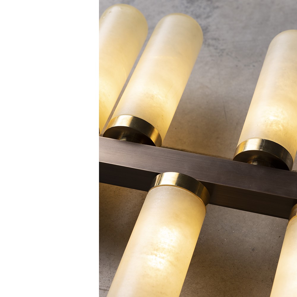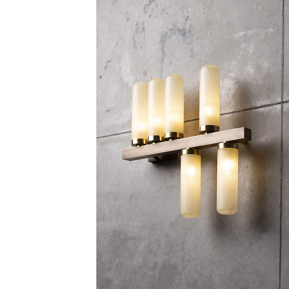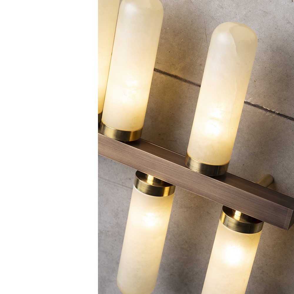 Horizontal wall lamp in burnished brass and details in natural brass with alabaster