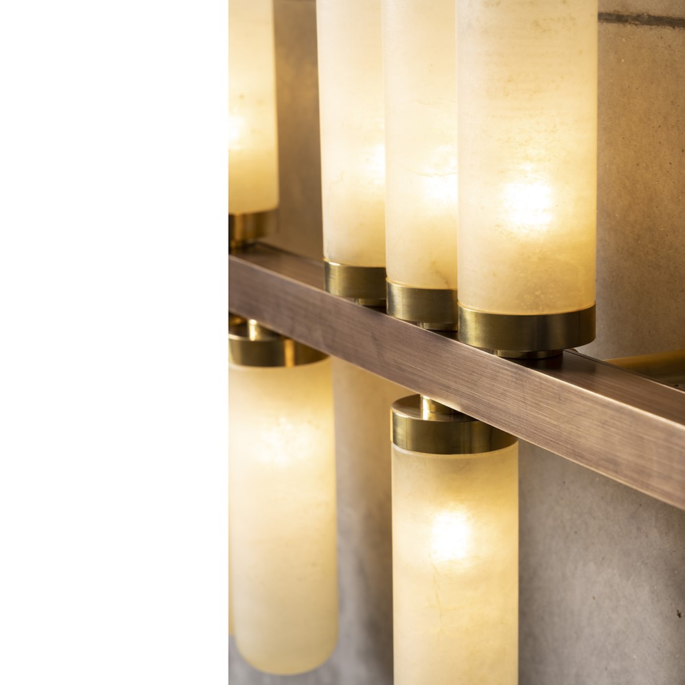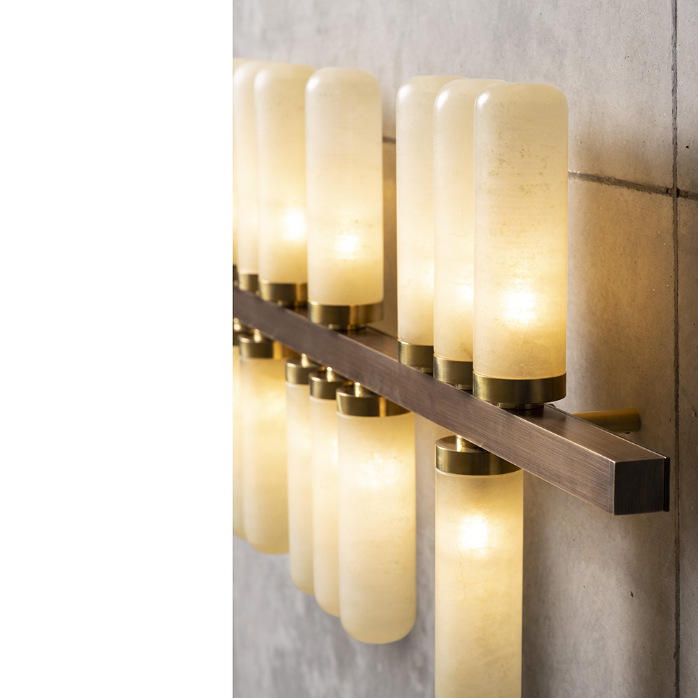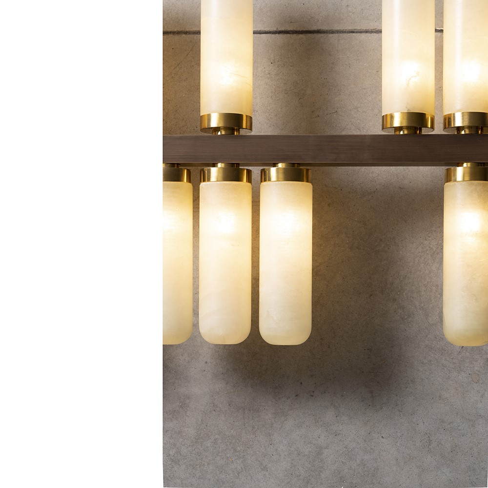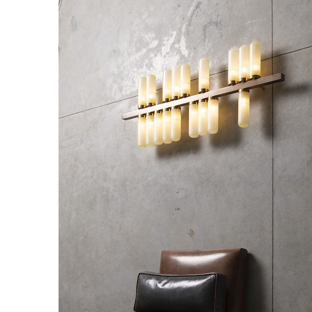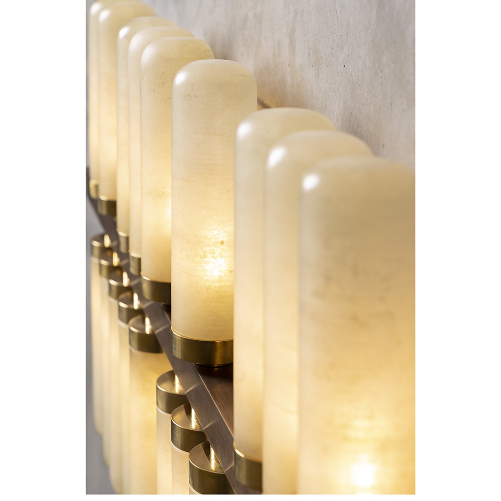 Horizontal wall lamp in burnished brass and details in natural brass with alabaster.