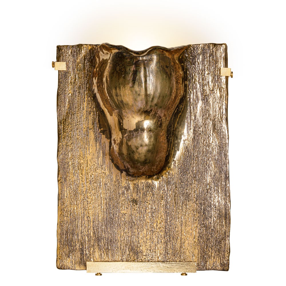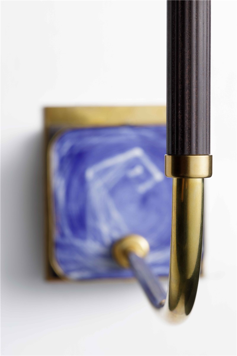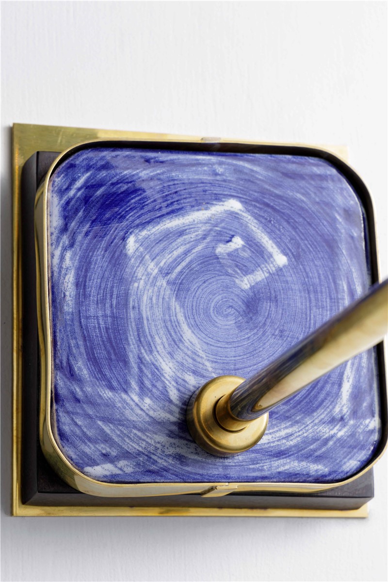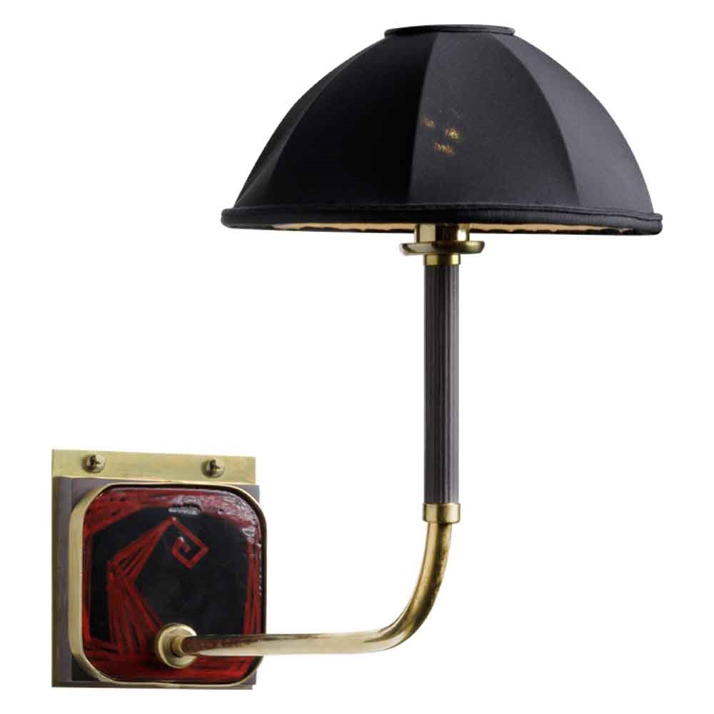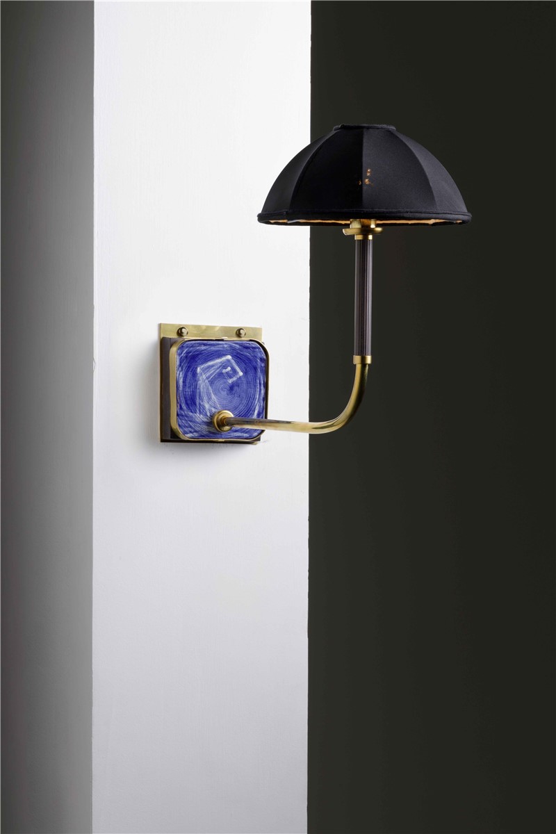 Brass wall light with hand-decorated ceramic tile with black lampshade.