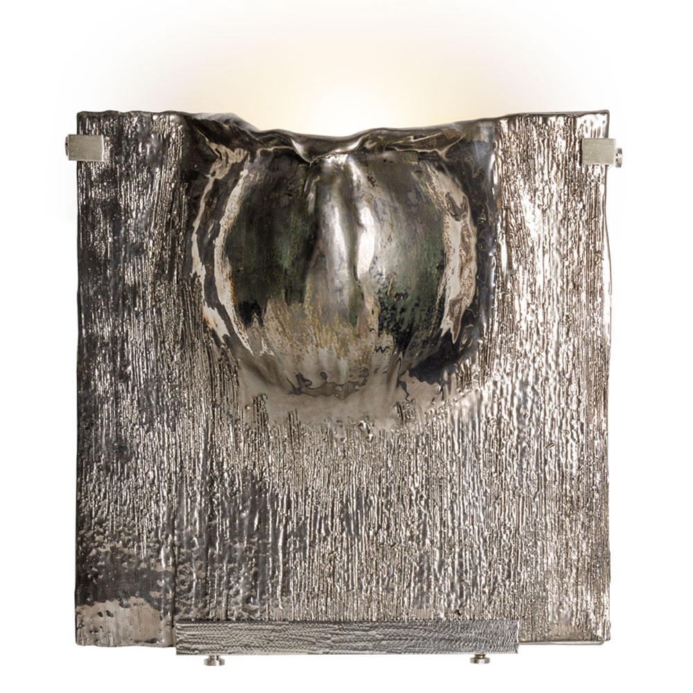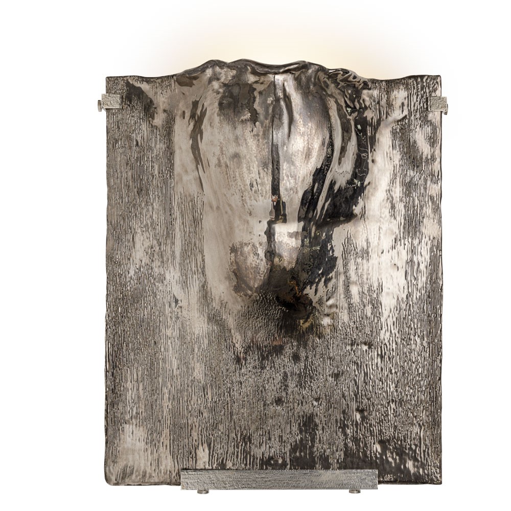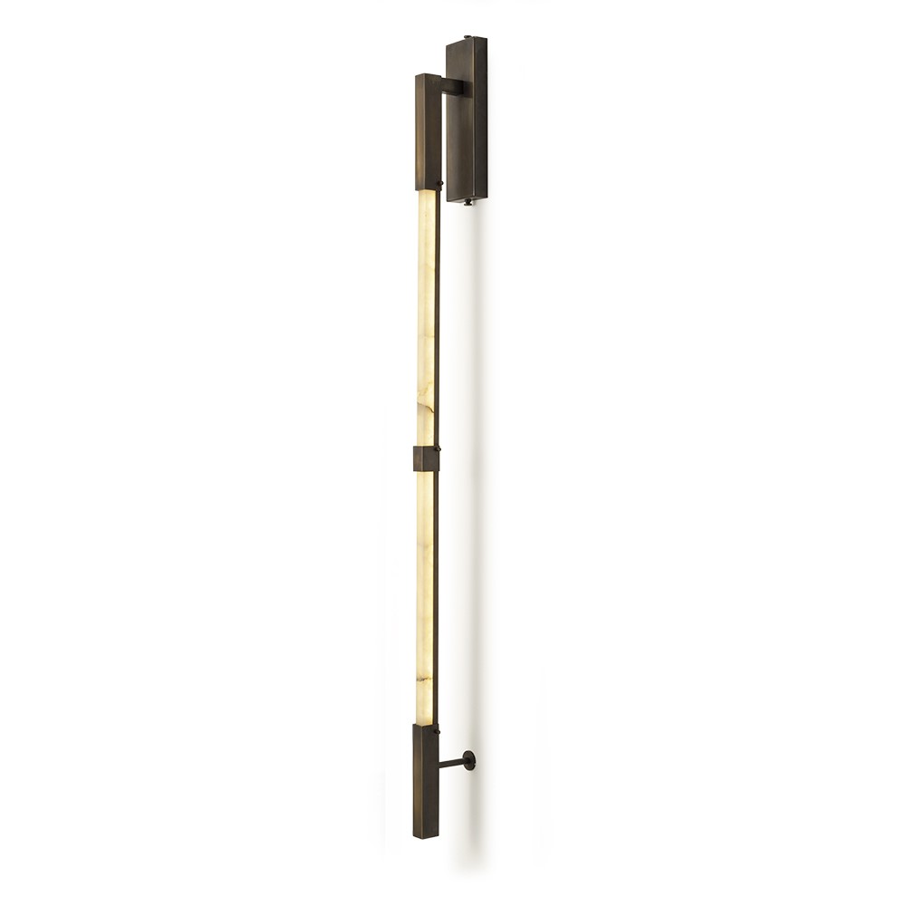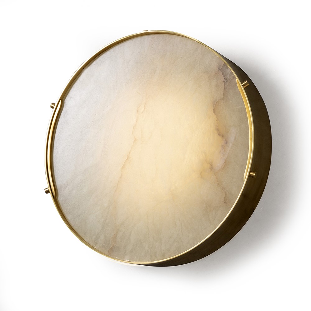 Brass wall light with hand-decorated ceramic tile with black lampshade.