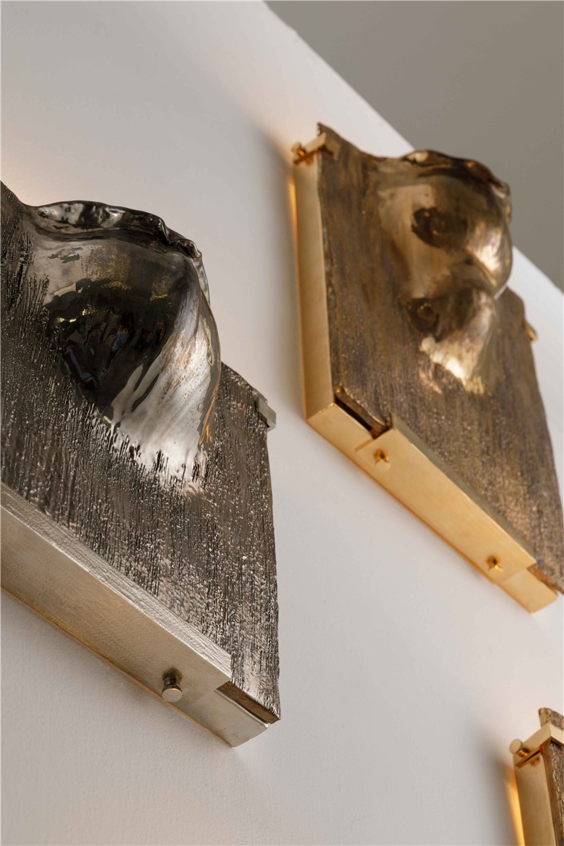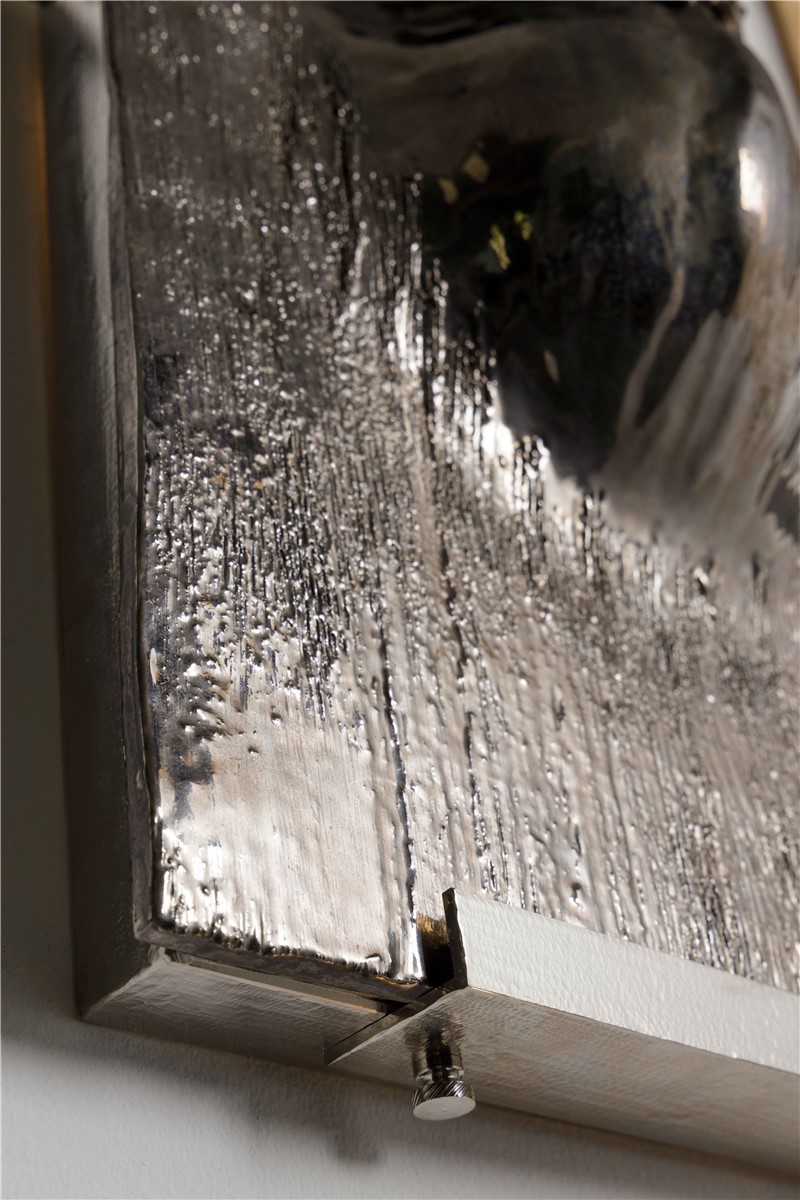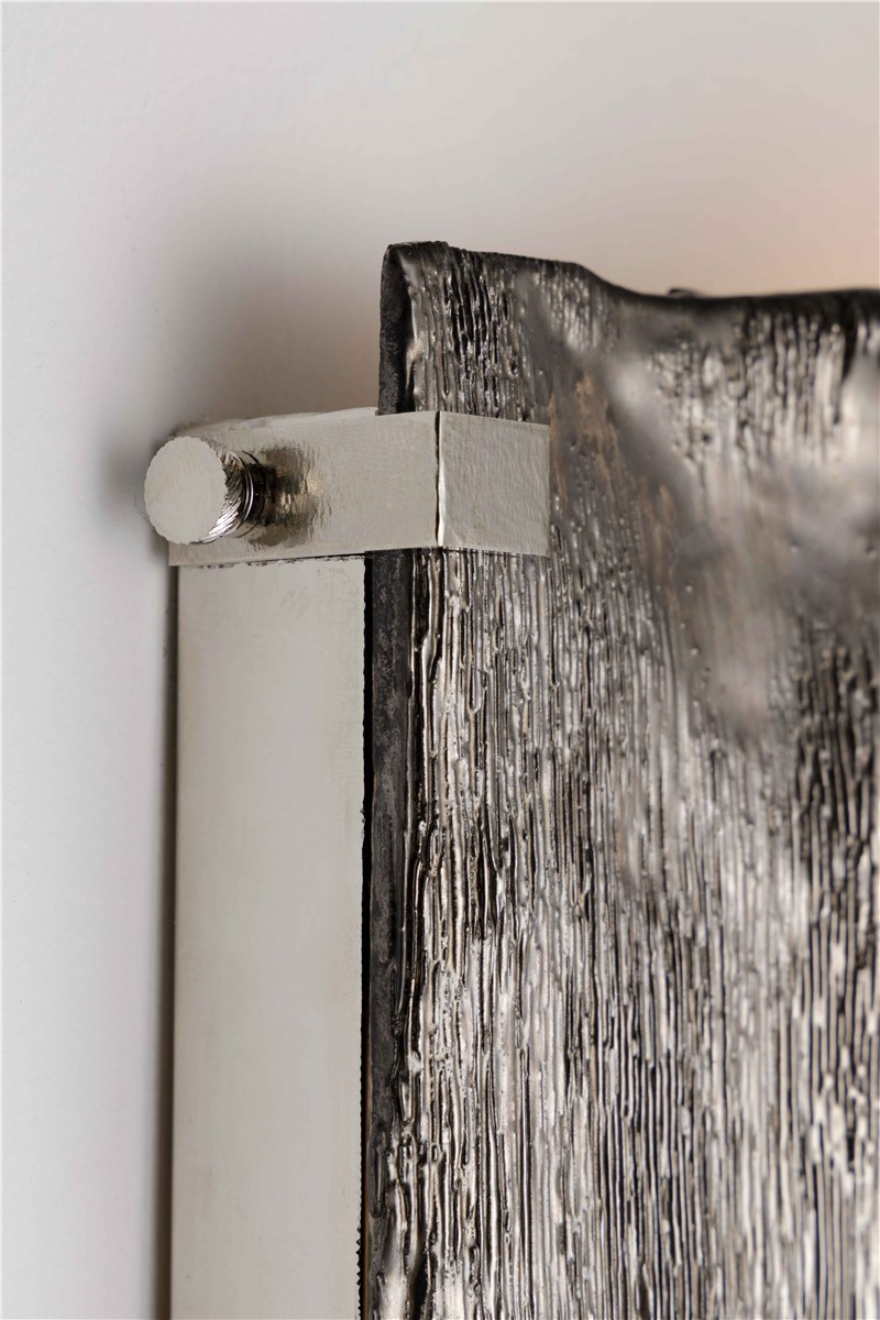 Rectangular wall lamp in hand-engraved and platinum-plated majolica with nickel-plated brass structure.