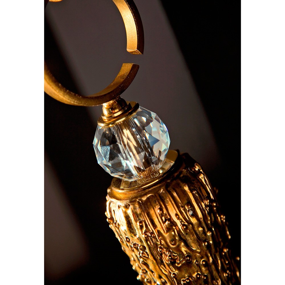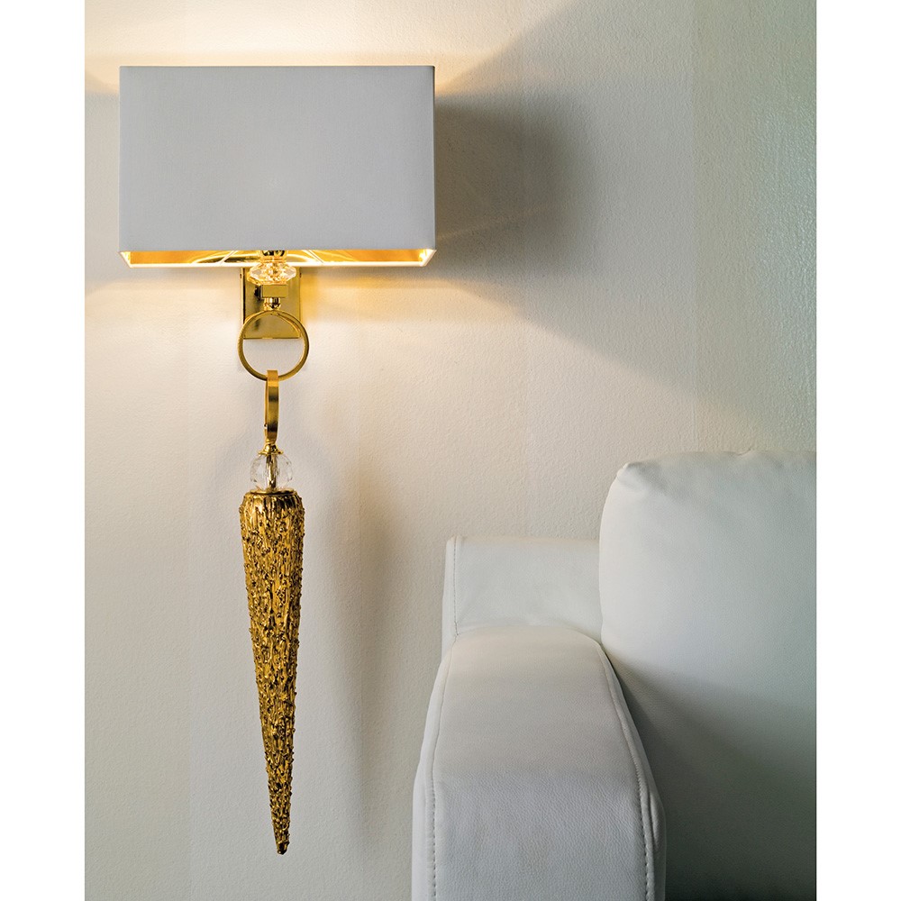 Wall lamp with golden brass structure. Majolica hanging element, gold plated, hand engraved with “candle effect”. Crystal details. White chintz lampshade with golden inside.
