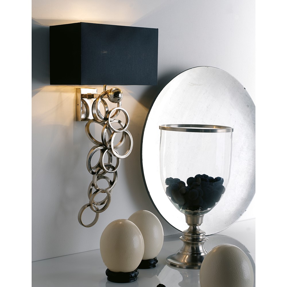 Iron wall lamp with silver-plated, hand soldered rings. Rectangular black chintz lampshade with silver coloured inside.