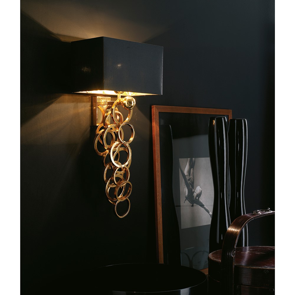 The wall light is formed by hand-welded iron circles one by one, structure and circles are in golden finish. The lampshade made to measure in fine black Chintz with a gold foil inside. It’s suitable for contemporary environments as well as for living areas, can adorn entrances and corridors. In the photo the height is 66cm but on request it can be modified in sizes and finishes.