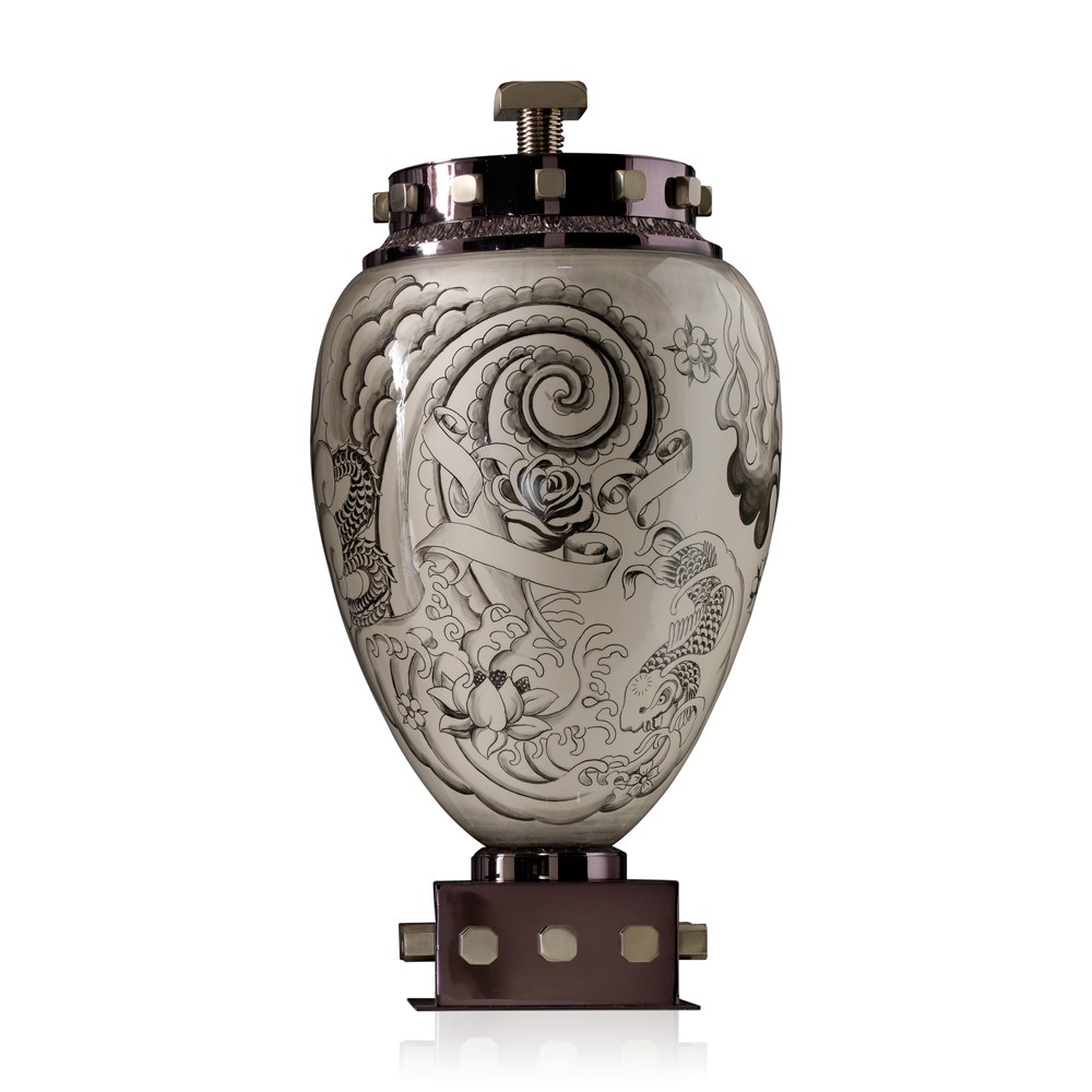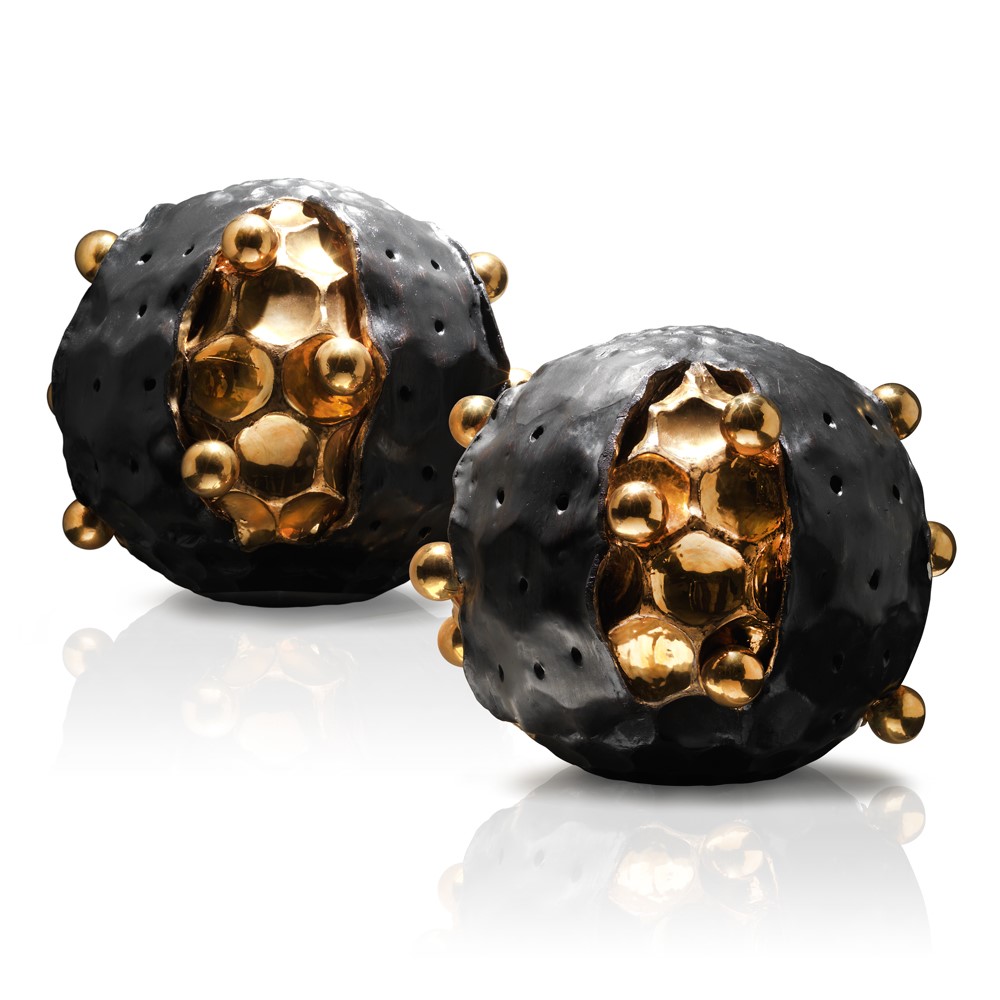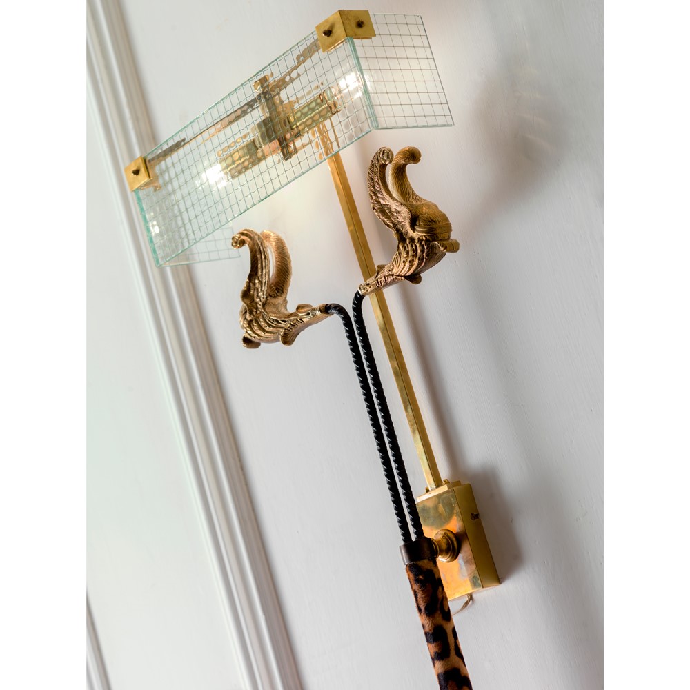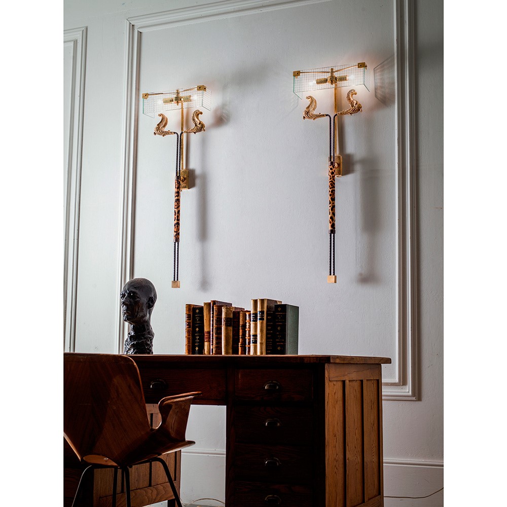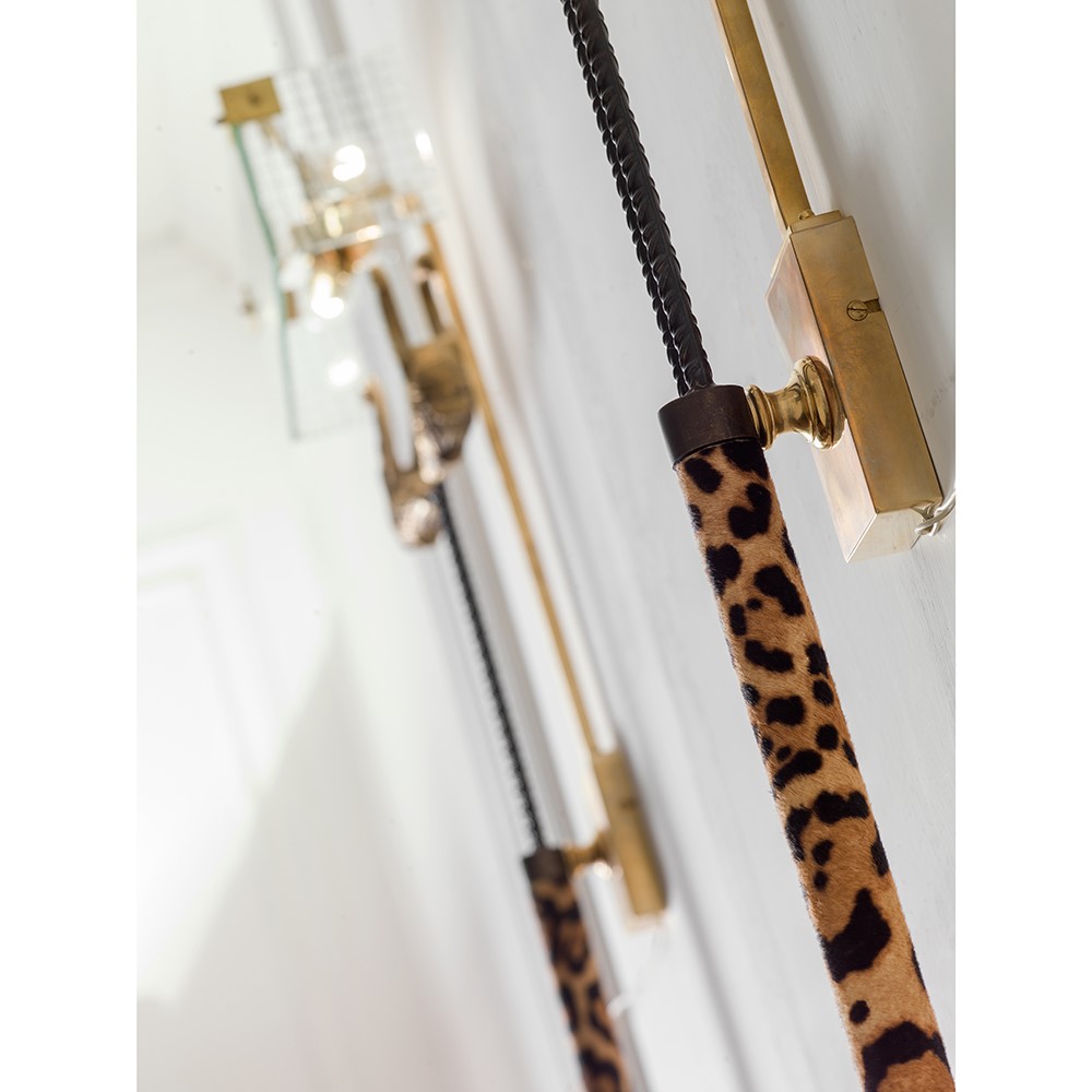 Wall lamp in brass and natural bronze. Reinforcing bar central shaft, covered with leopard printed pony leather. Natural brass and wire glass lampshade.