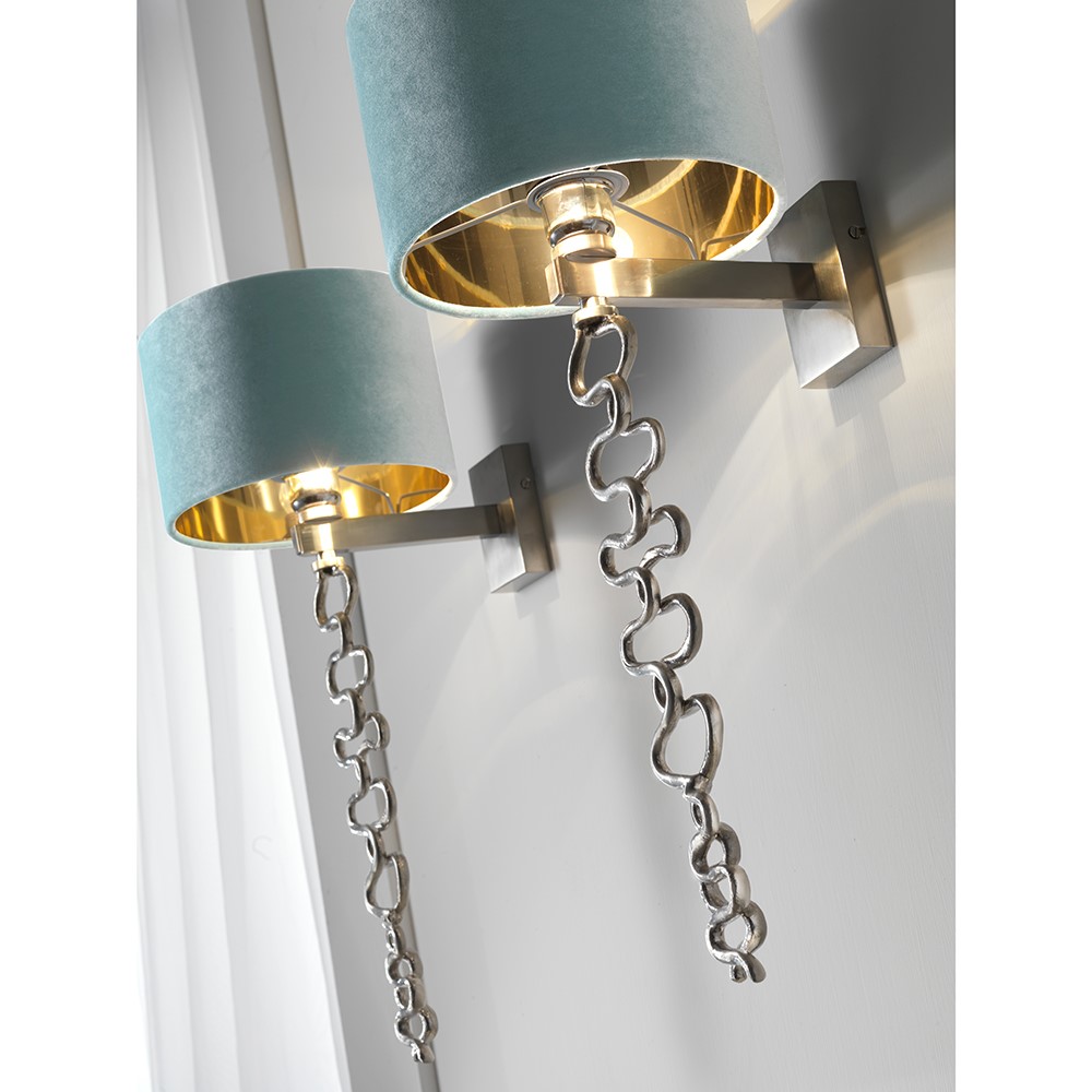 Bronze wall lamp with brushed, coated, chromed finish and pewter finish. Silk velvet lampshade with golden inside.