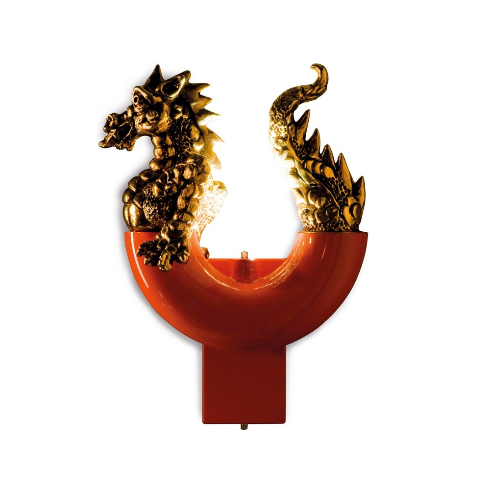 Wall lamp with hand decorated majolica elements. Light burnished brass structure.