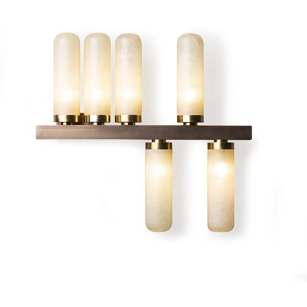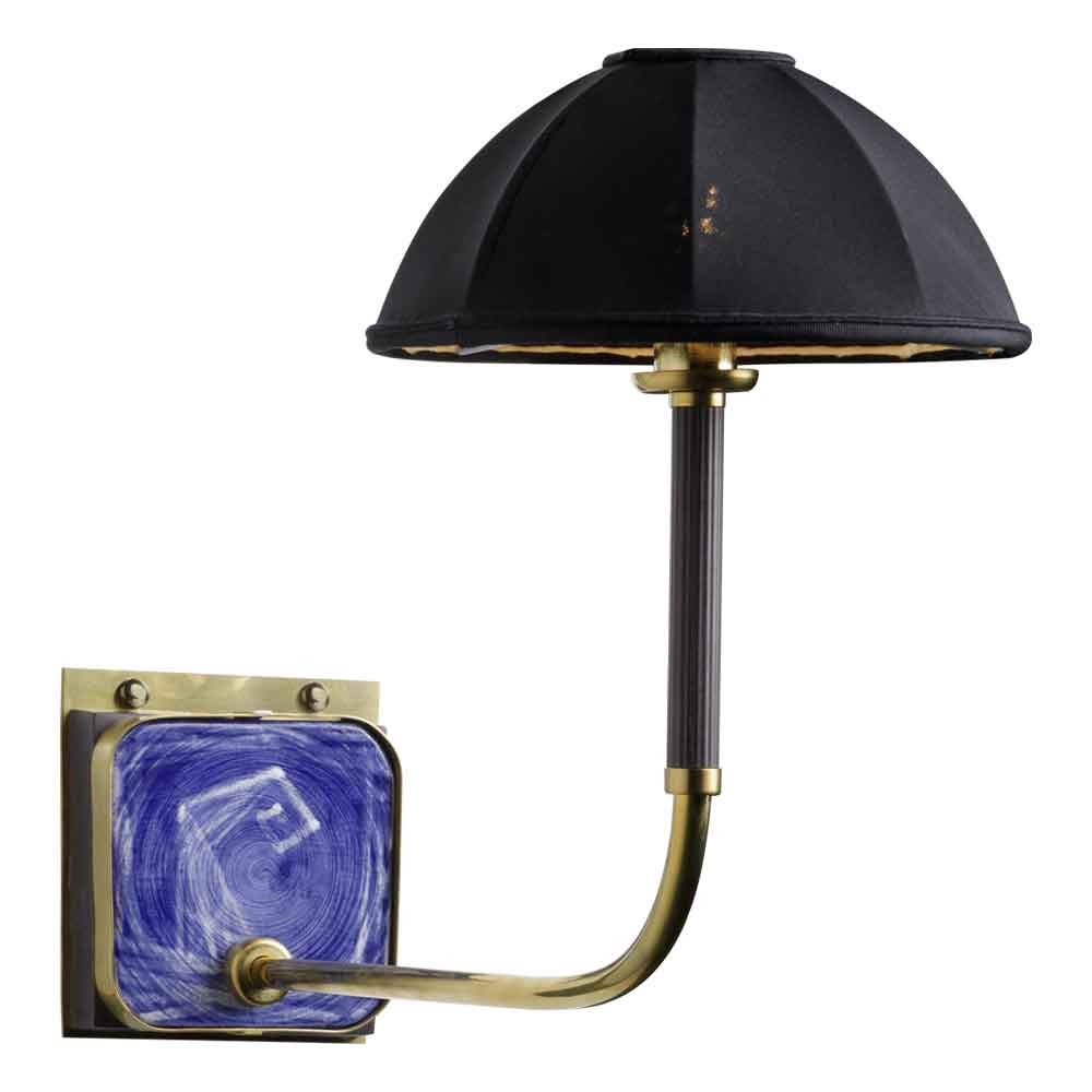 Golden brass wall lamp with iron gearwheels in pewter and brushed chrome finish. Black chintz lampshade with golden inside.