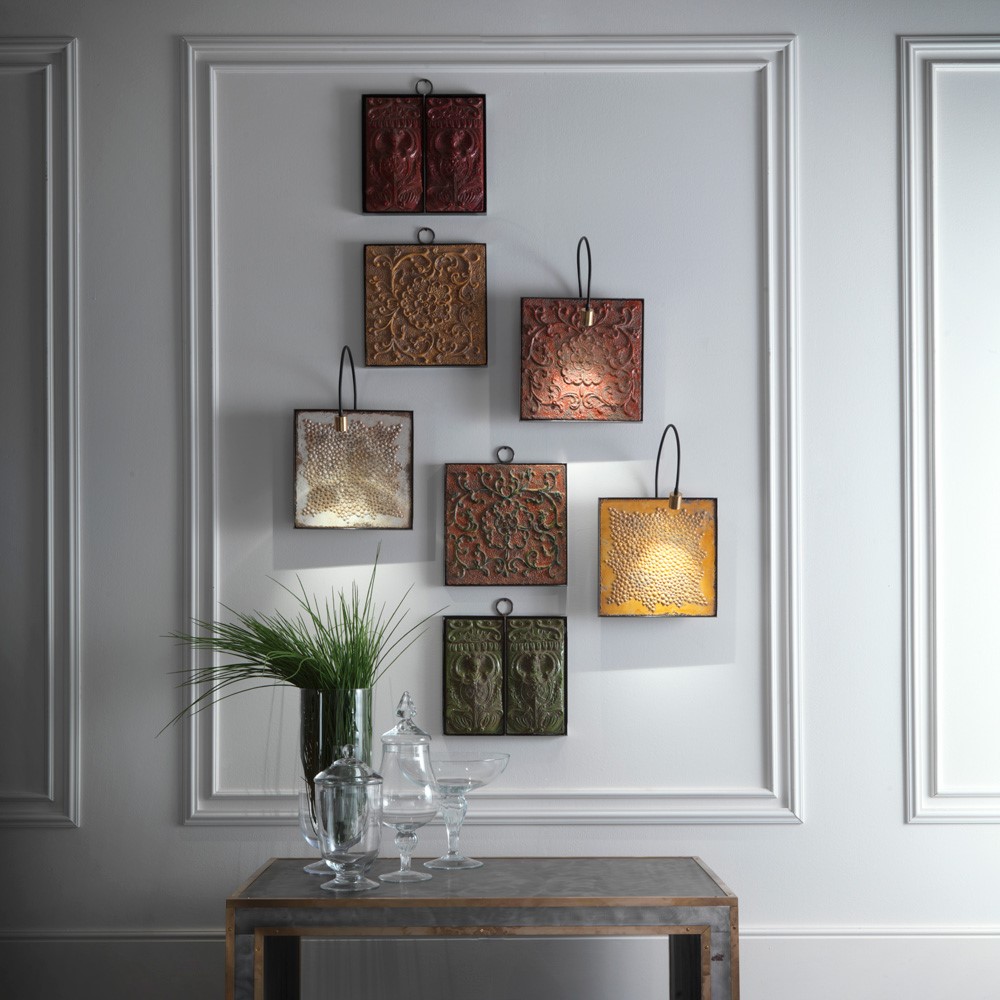 Wall lamp with emery iron structure and hand engraved majolica panel, real gold or platinum glazed.