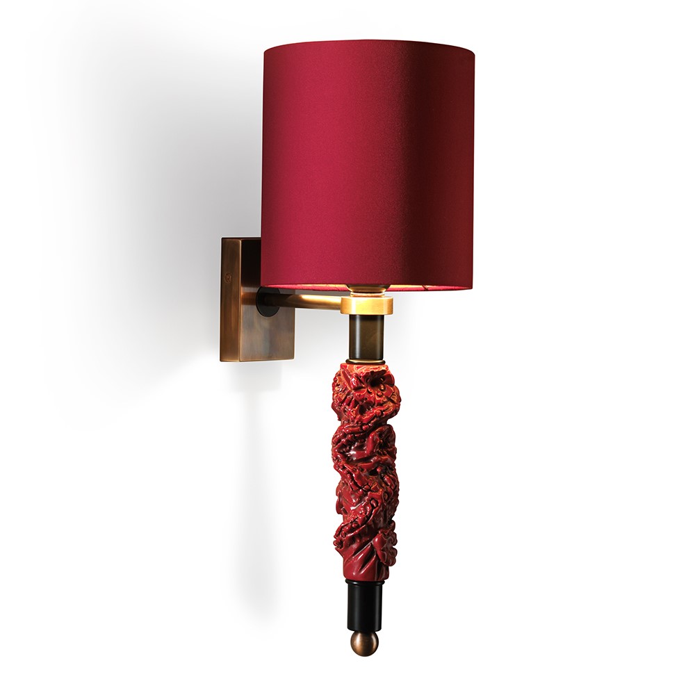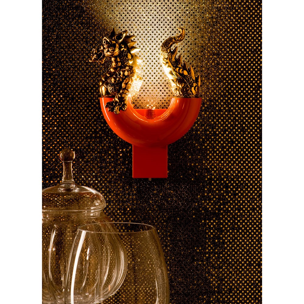 Wall lamp with lacquered iron structure. Hand engraved and gold plated majolica dragon.