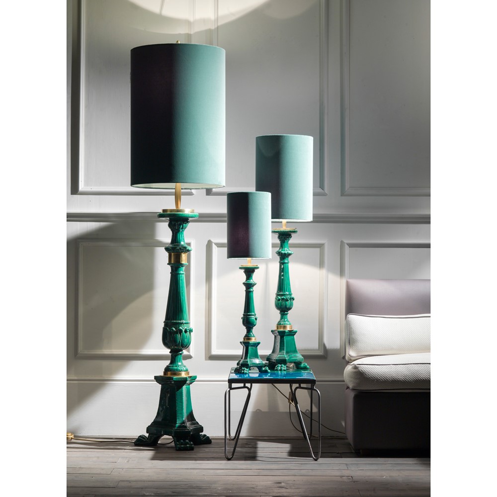 Hand engraved and glazed majolica lamp with natural brass details. Velvet lampshade.