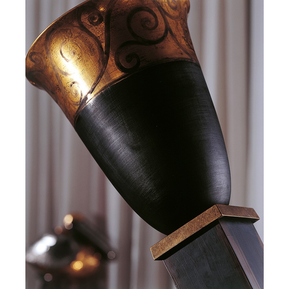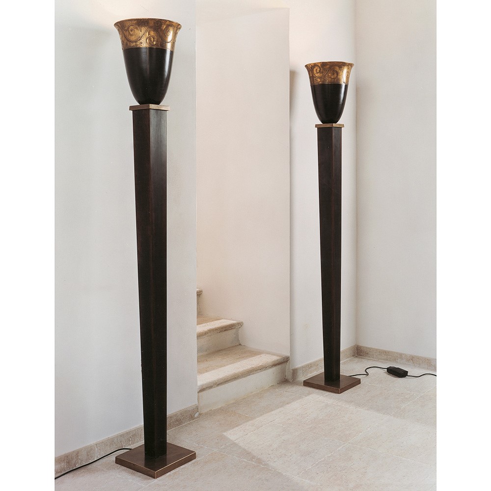 This floor lamp has chromatic affinities in the different components that compose it. The central part of the barrel is in wood lacquered by hand with a mocha brown lacquer, the upper cup is majolica and is enameled in mocha brown with an upper band decorated in pure gold. In the rest of the lamp the details are all in natural brass. The lamp is a combination of the natural tones of brown and a warm tone of brass that is found in the brass and pure gold of the upper tank. Suitable for both contemporary and classic interiors.