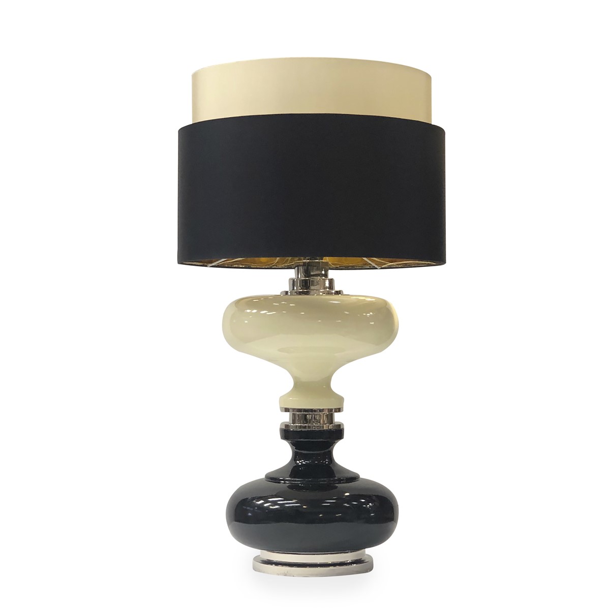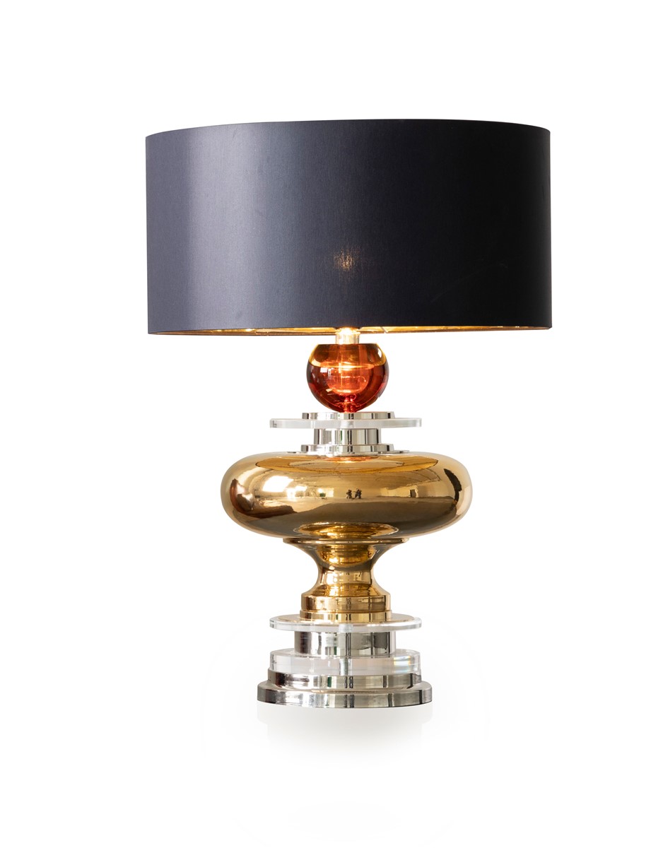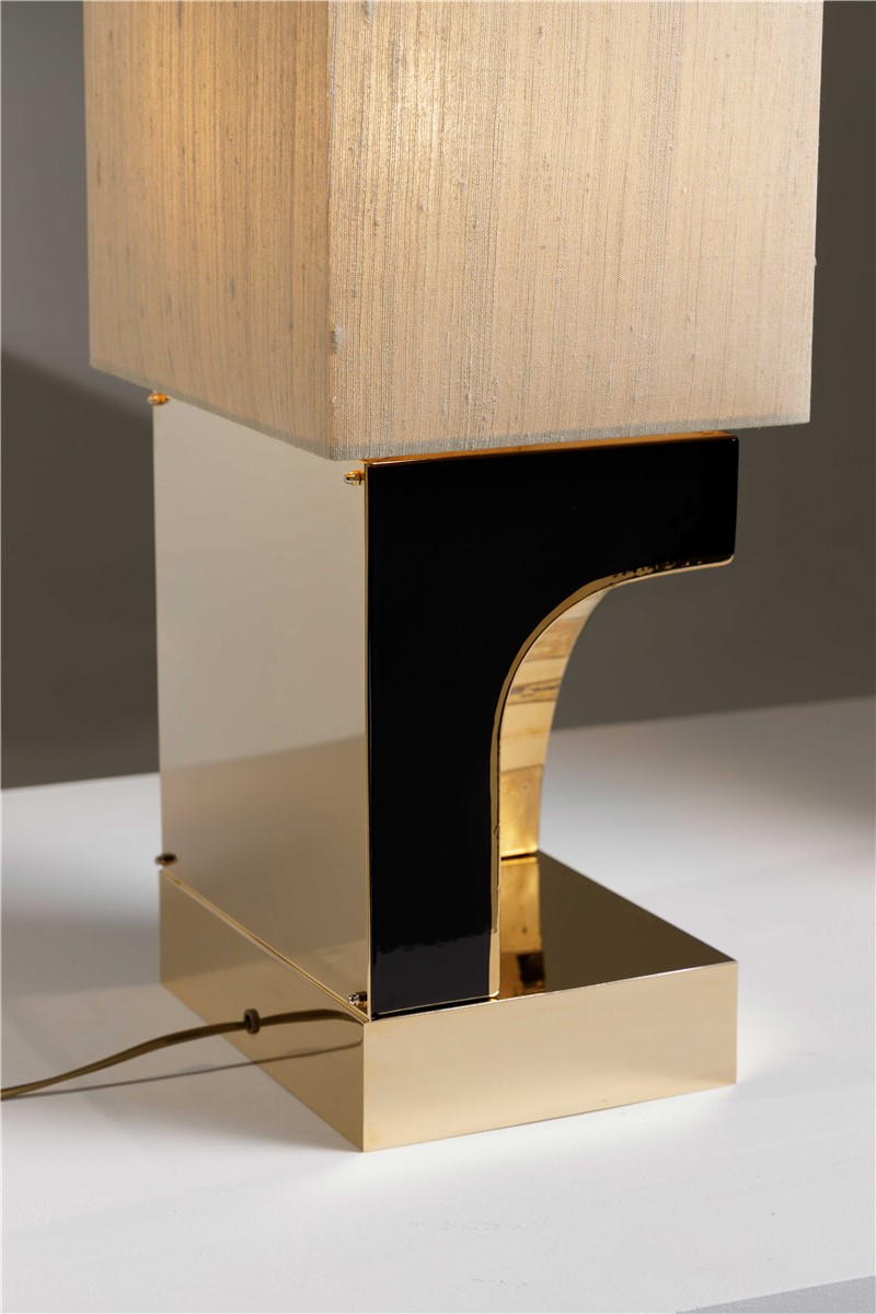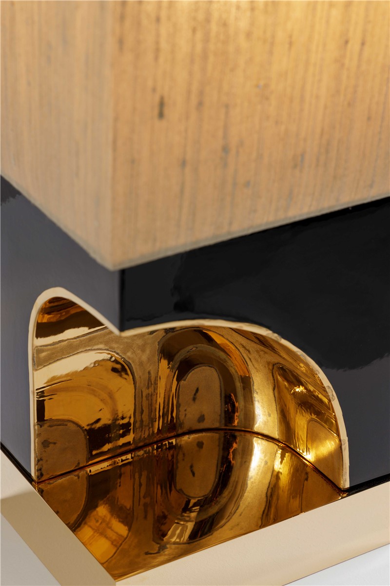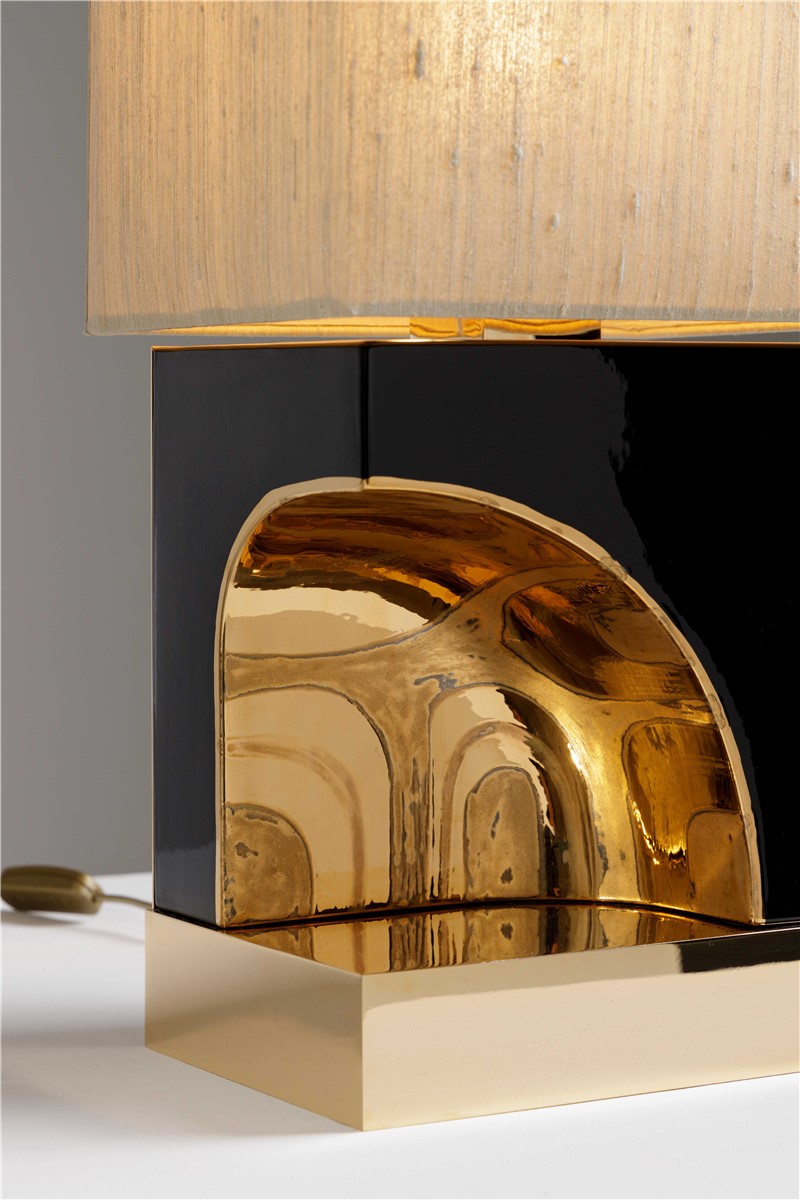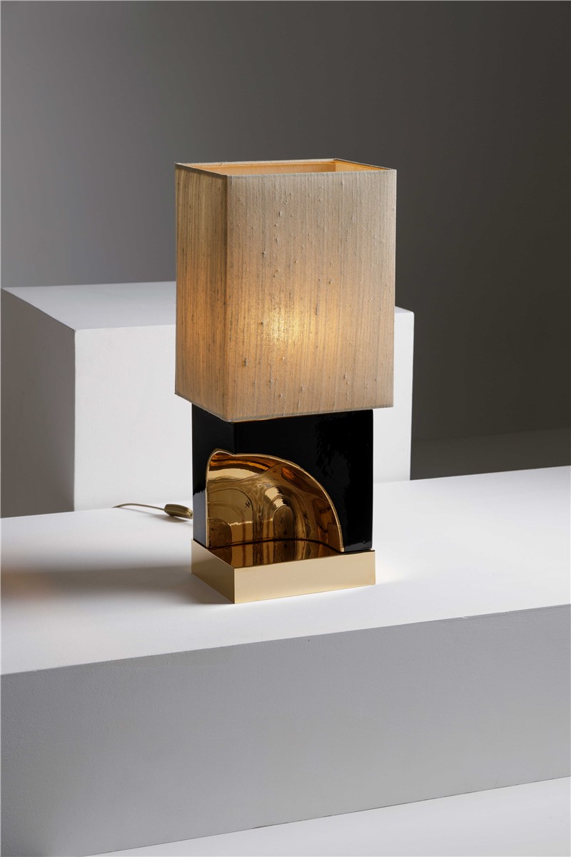 Table lamp majolica hand decorated with gold and details in gilded brass. Lamp shade is in row silk.