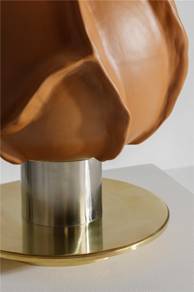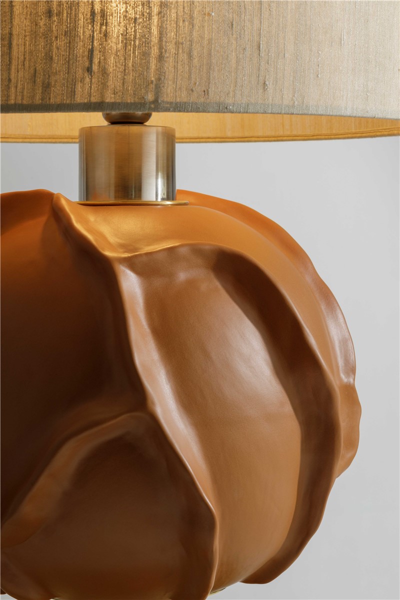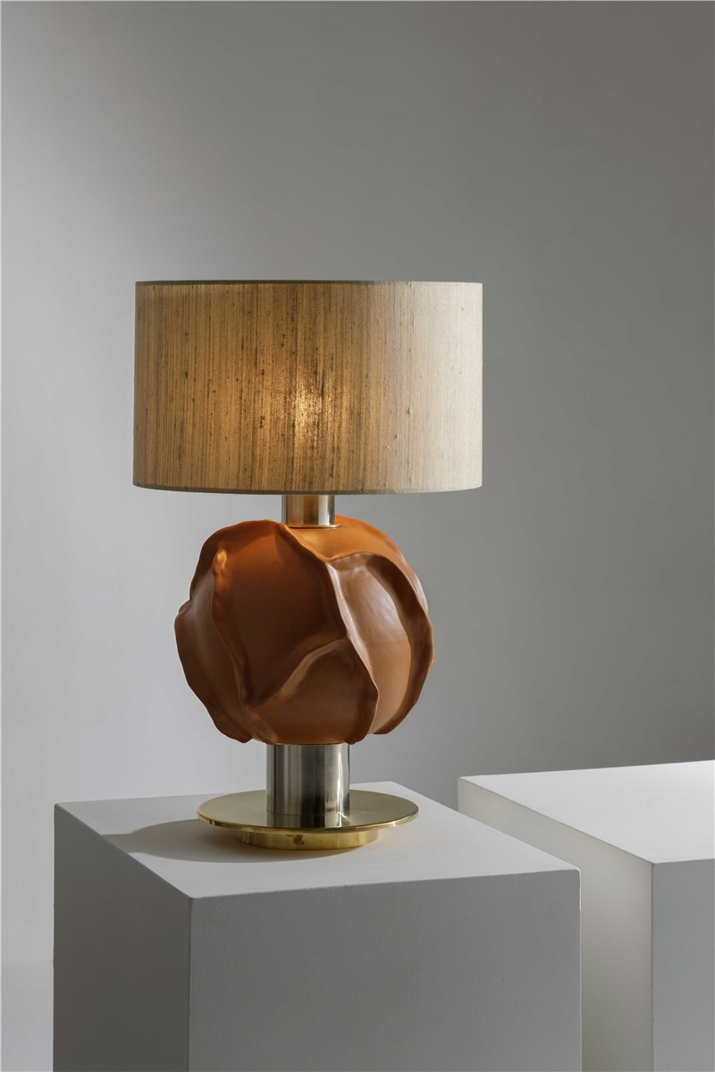 Table lamp in majolica hand engraved and decorated details in natural brass and semi matt brushed nickel brass. Lamp shade in row silk