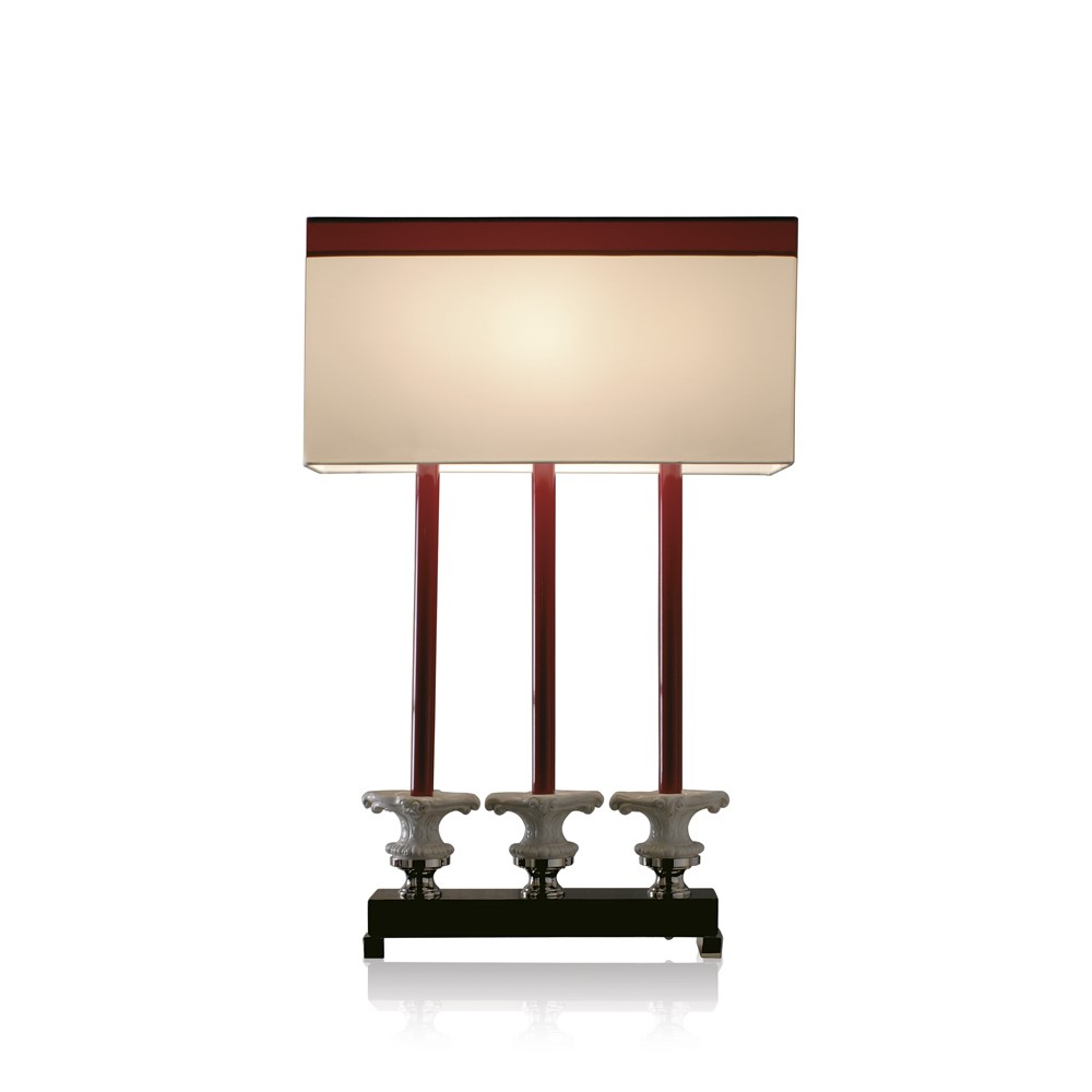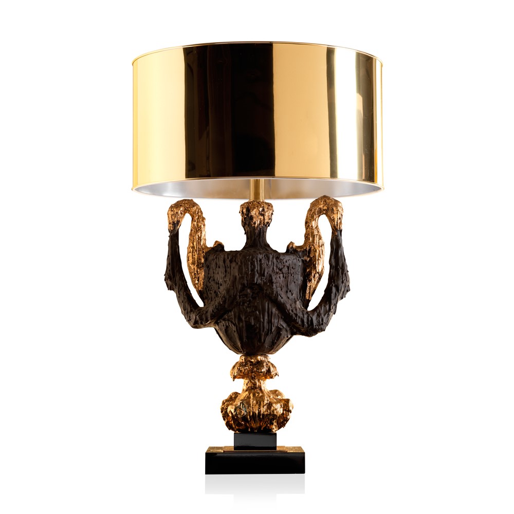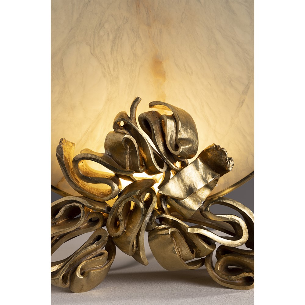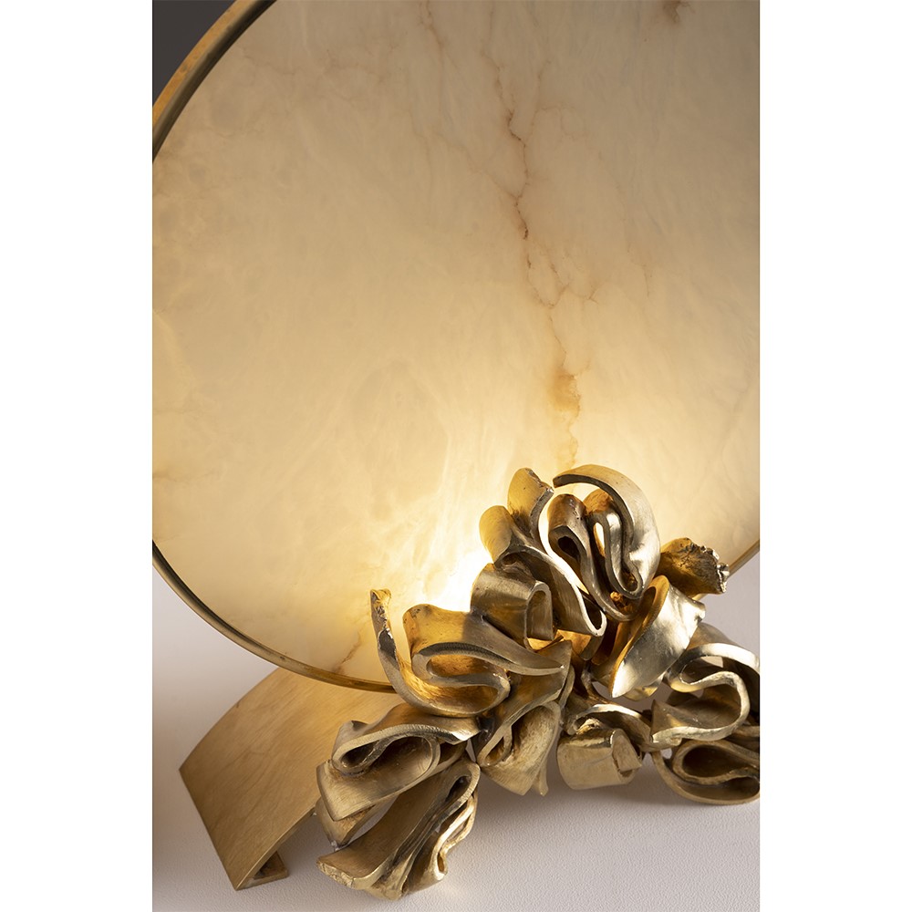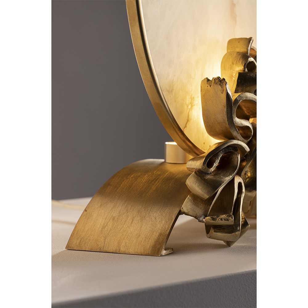 Table lamp in brass and bronze castings in natural finish with alabaster.