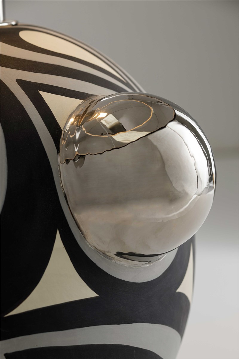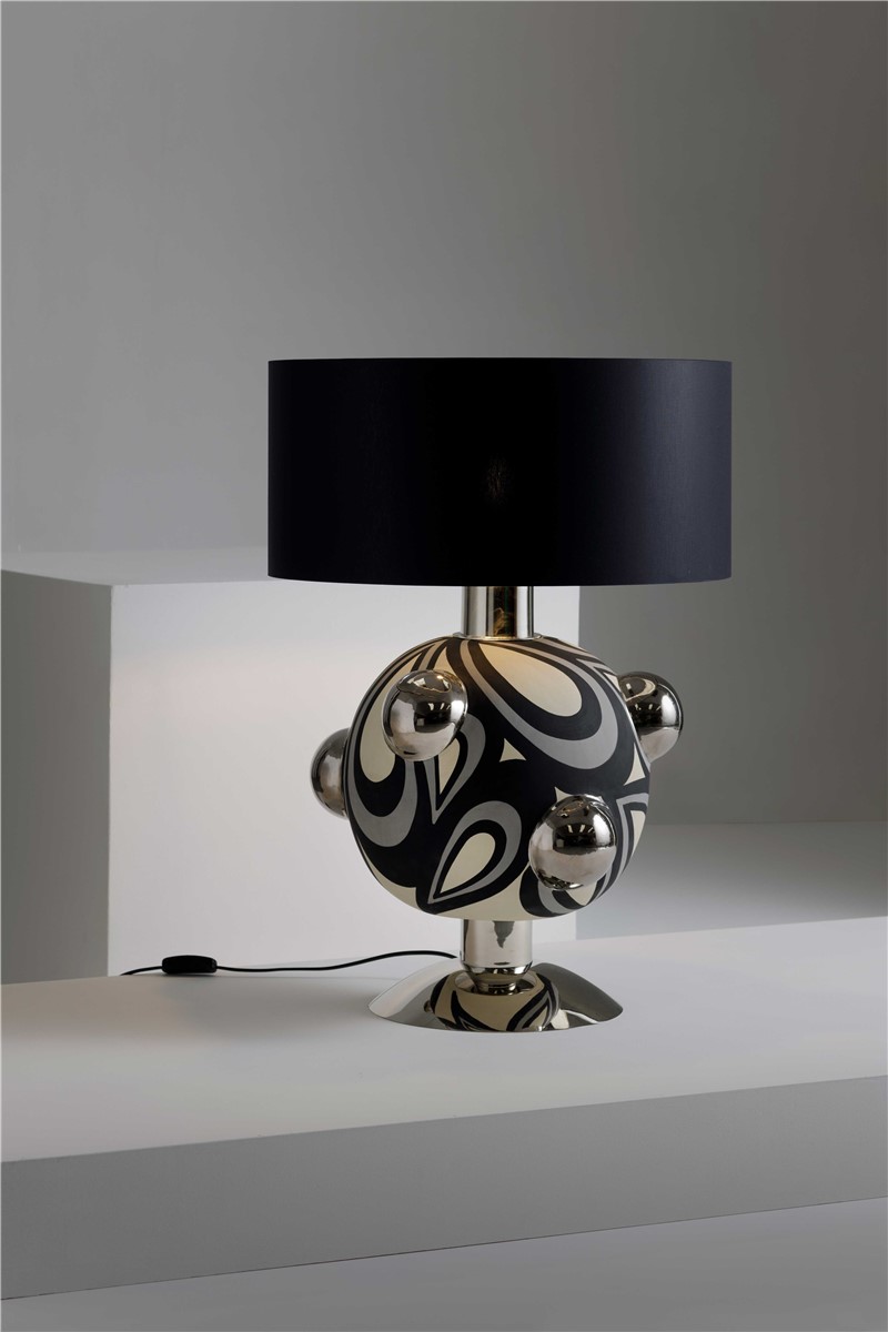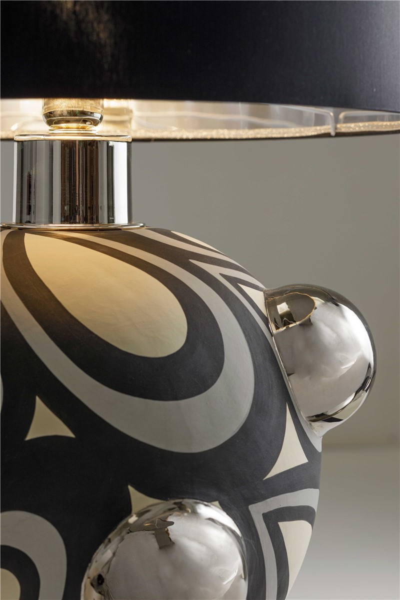 Table lamp majolica hand decorated with platinum and details in nickel brass. Lamp shade in black inside silver