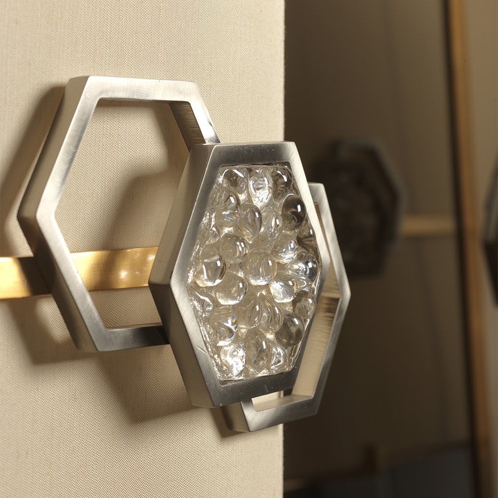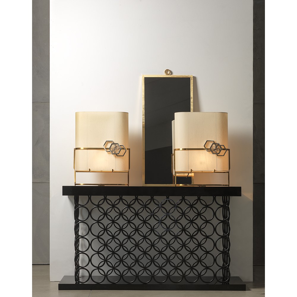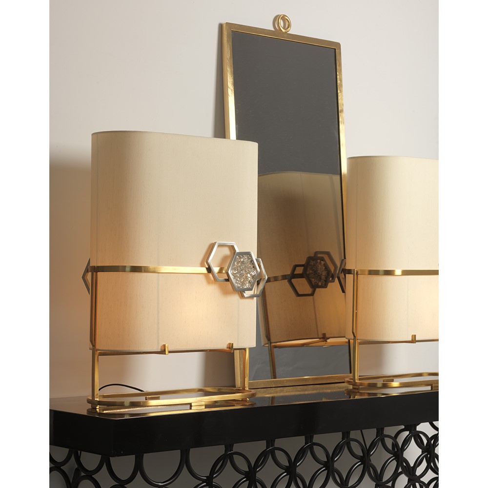 Lamp in gilded and nickel-plated brass with accent glass. Lampshade is in silk.