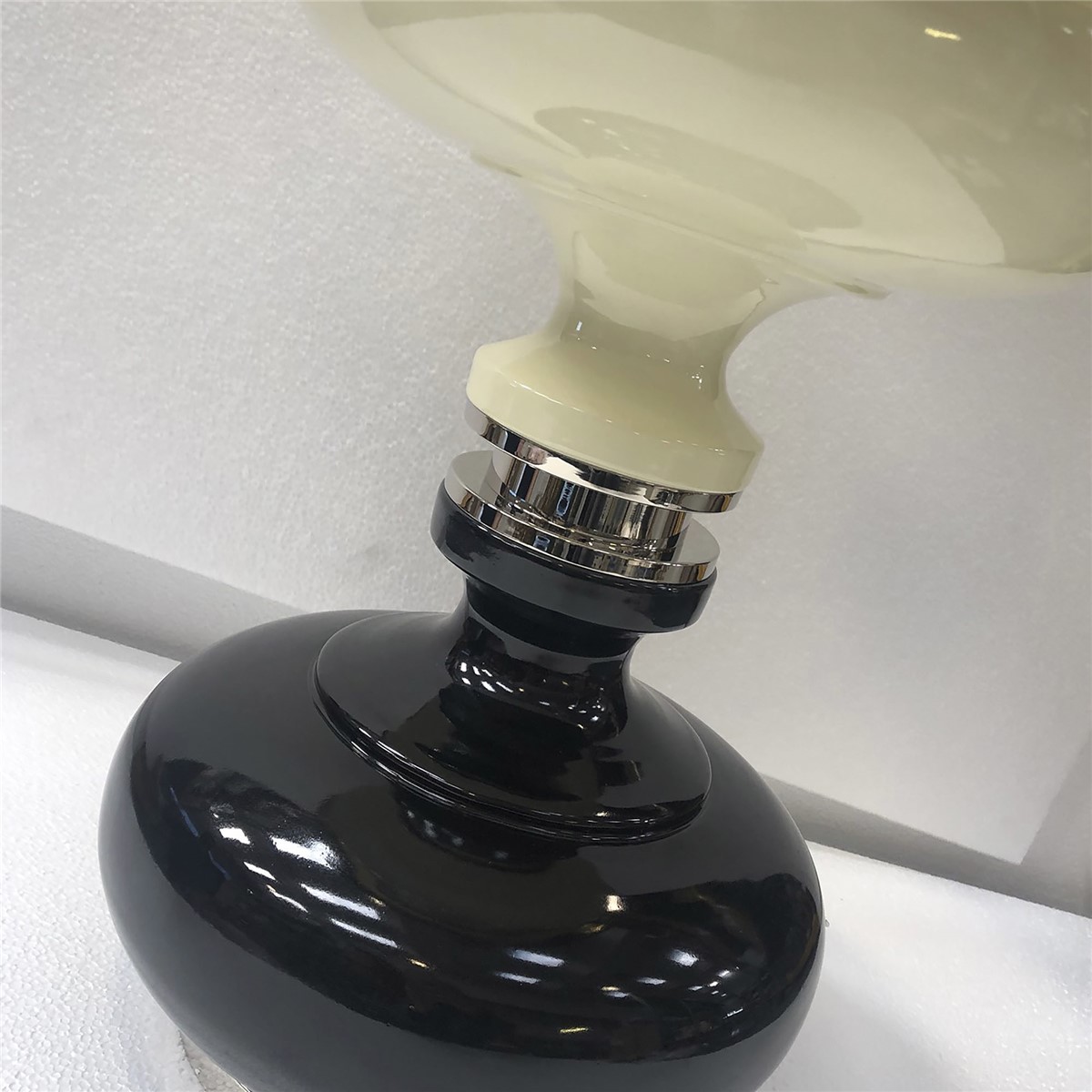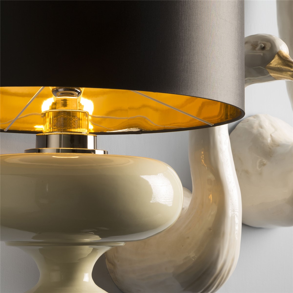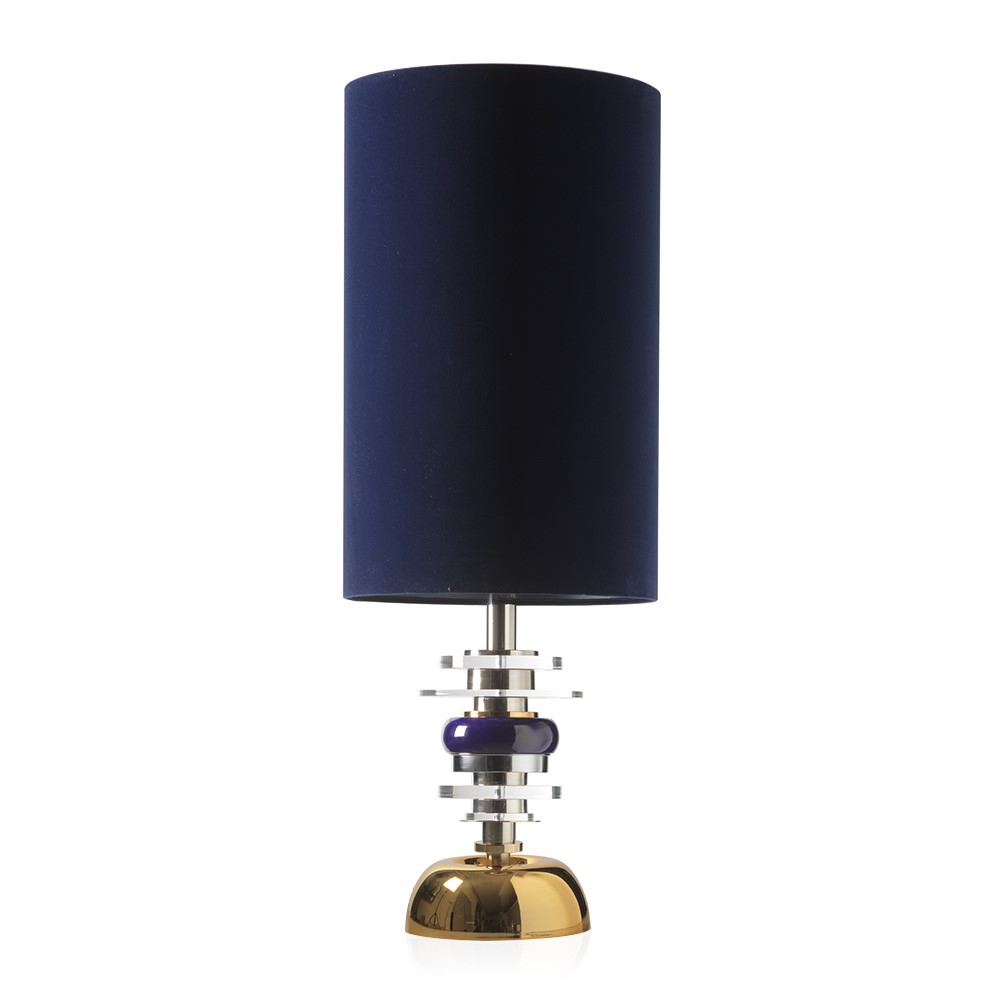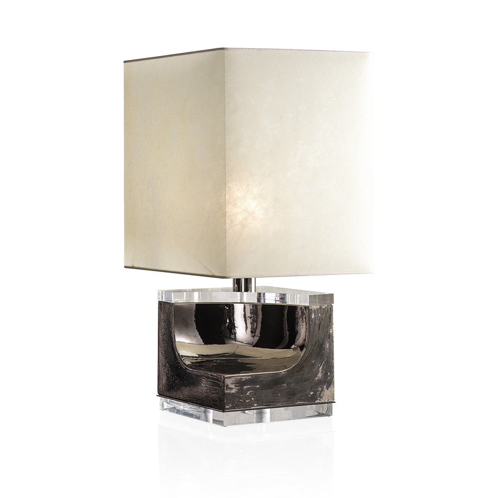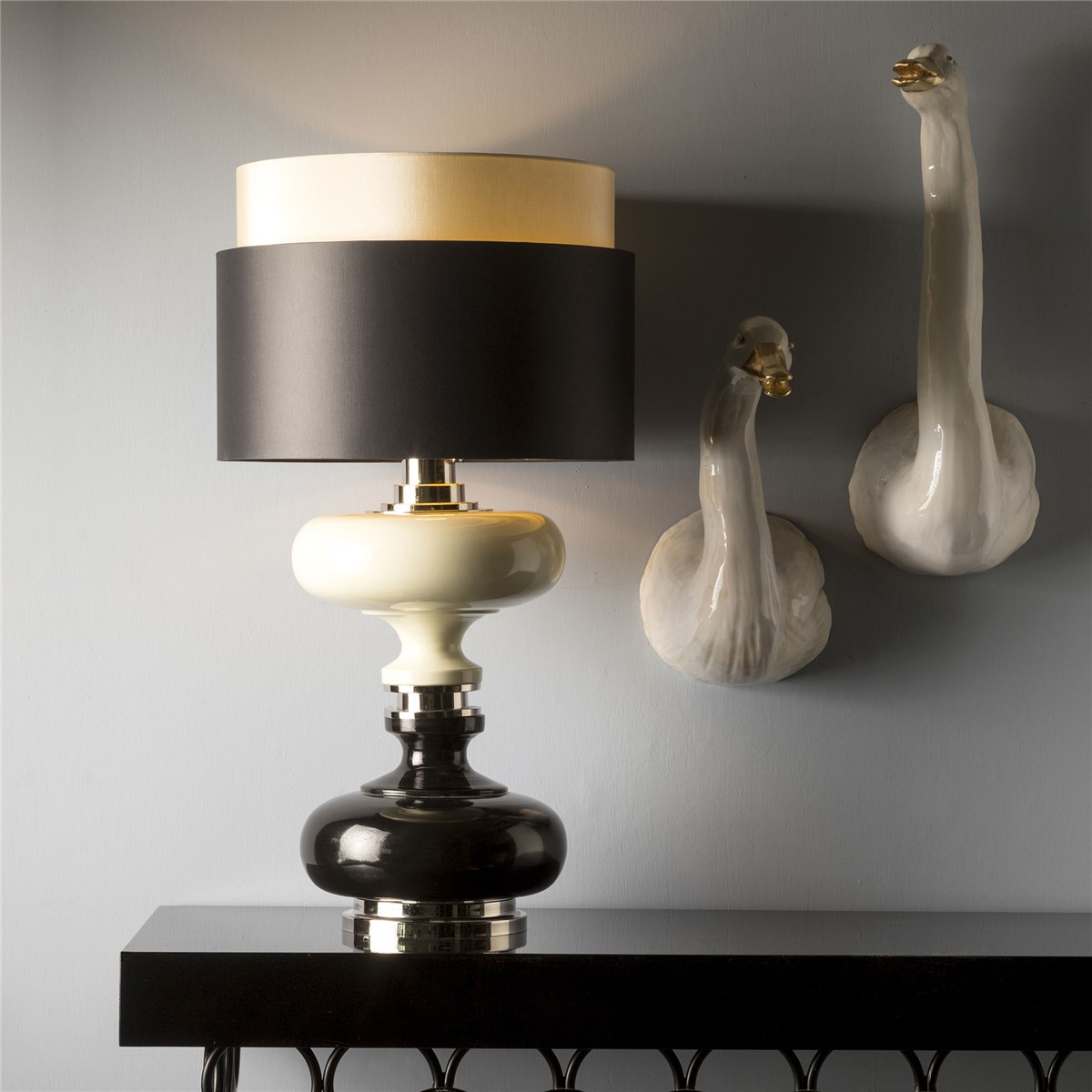 Lamp in hand glazed majolica with details in nickel plated brass. Lampshade in black inside gold and ivory.
