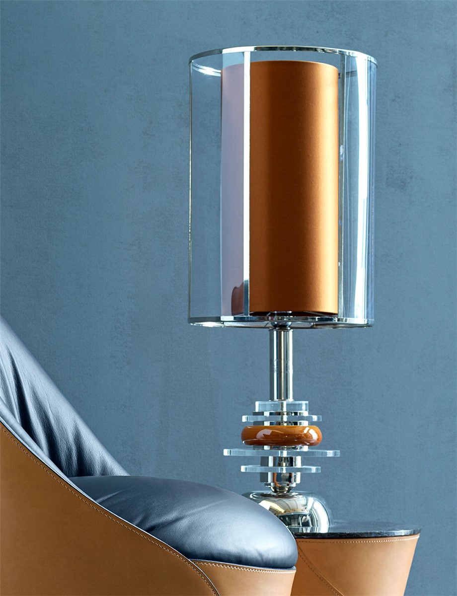 Lamp composed in majolica, nickel-plated brass and plexiglass. The lampshade is double in nickel-plated brass with plexiglass and in silver woven fabric.