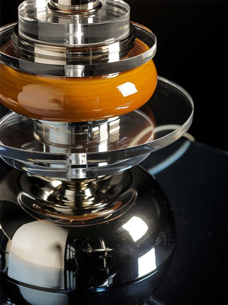 Lamp composed in majolica, nickel-plated brass and plexiglass. The lampshade is in amber satin.