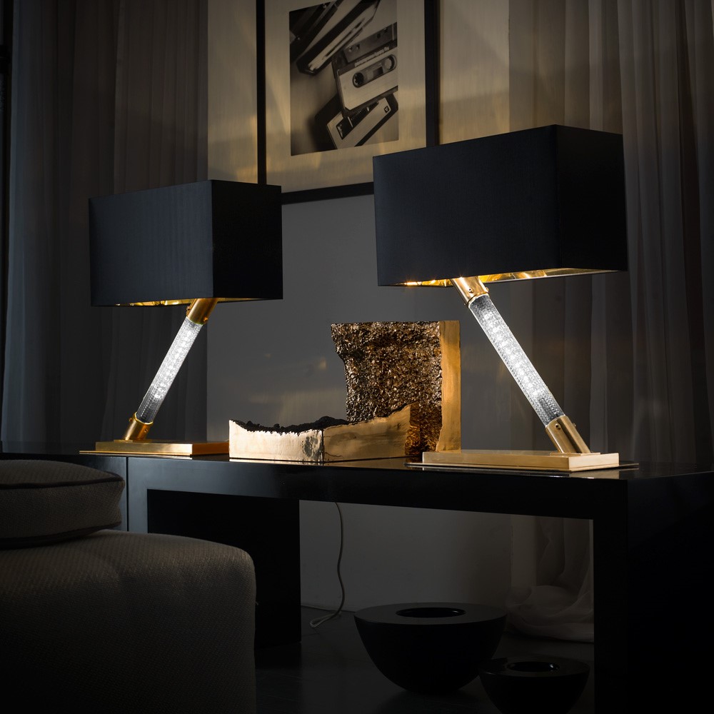 Lamp with golden brushed brass base and details. Hand cut crystal cylinder with inner lighting and shade lighting. Black chintz lampshade with golden inside.