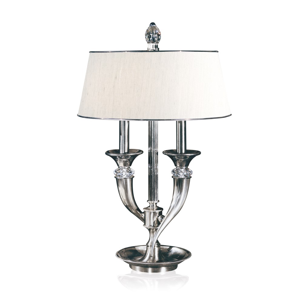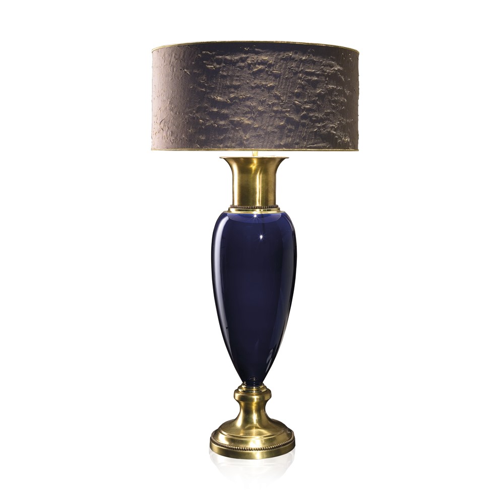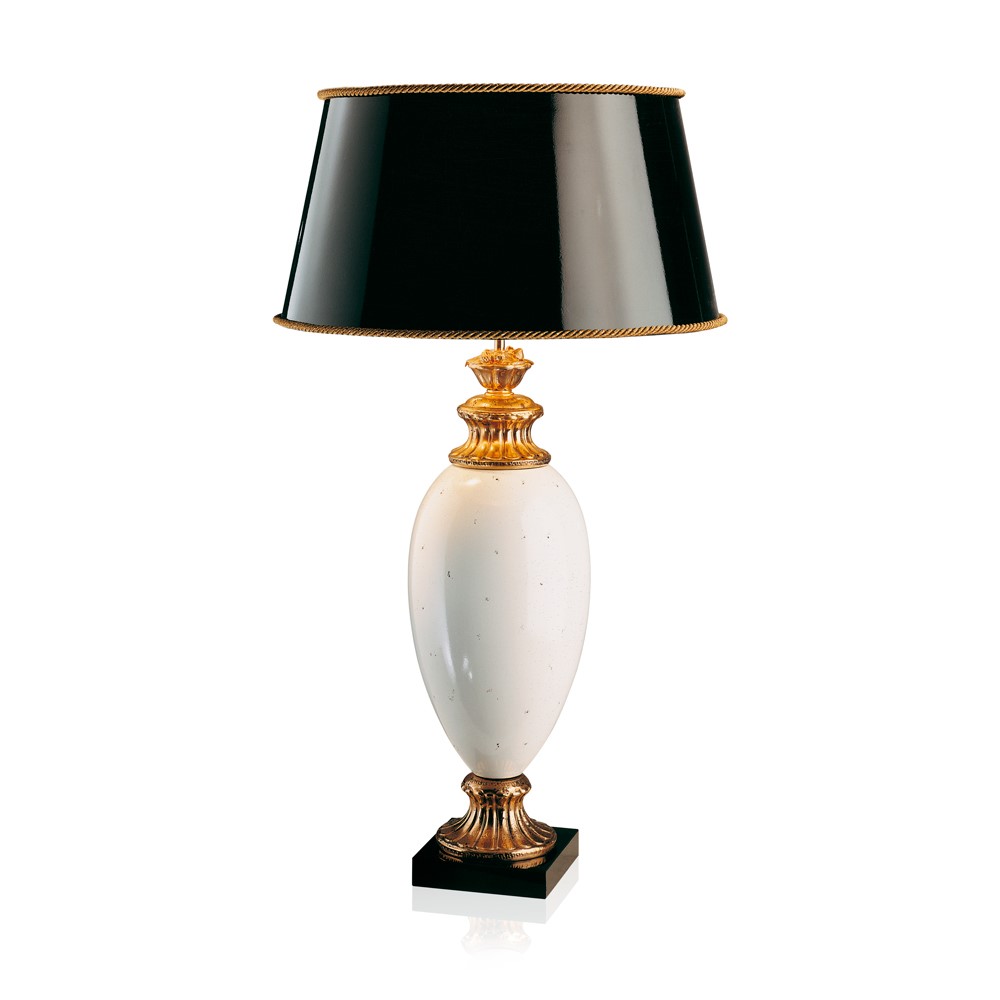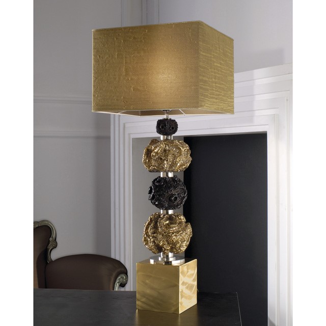 Lamp in hand engraved and gold plated majolica. Chromed brass details and golden, brushed iron base. Double golden silk “lux” lampshade over brown taffeta.