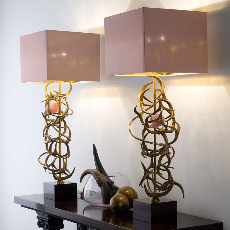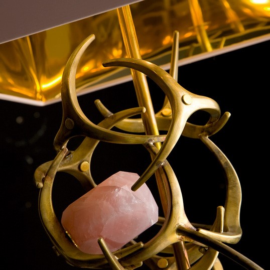 Lamp in hand soldered bronze with natural finish. Pink quartz stone. Makassar ebony base. Pink silk lampshade with golden inside.