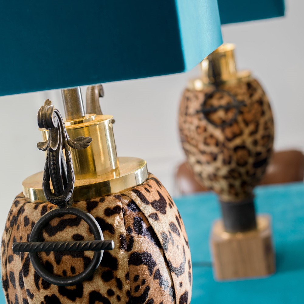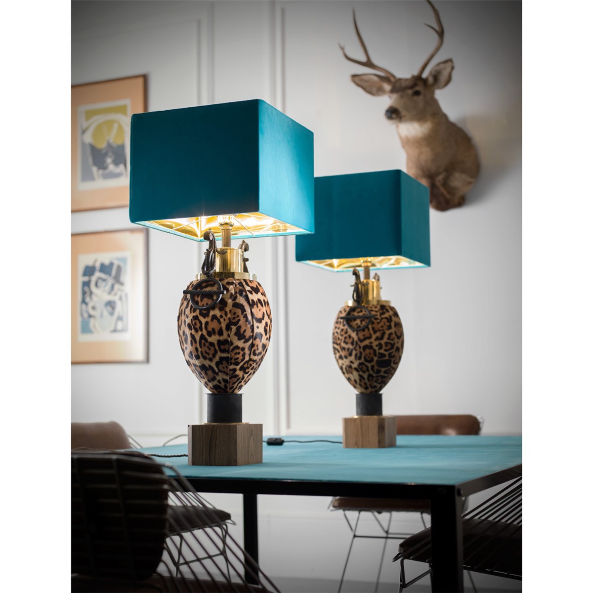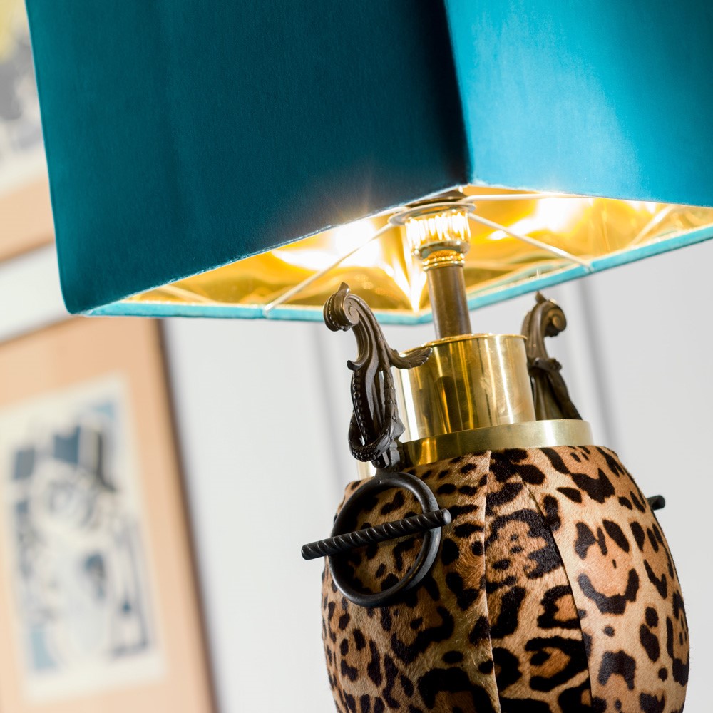 Lamp with central shaft covered with leopard printed pony leather, untreated wooden base, natural brass details and matt gold/black bronzes. Velvet lampshade with golden inside.