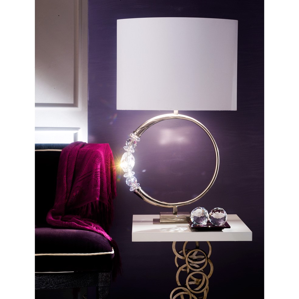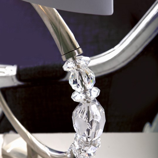 Chromed brass lamp with hand cut crystal details and crystal. White chintz lampshade with silver coloured inside.