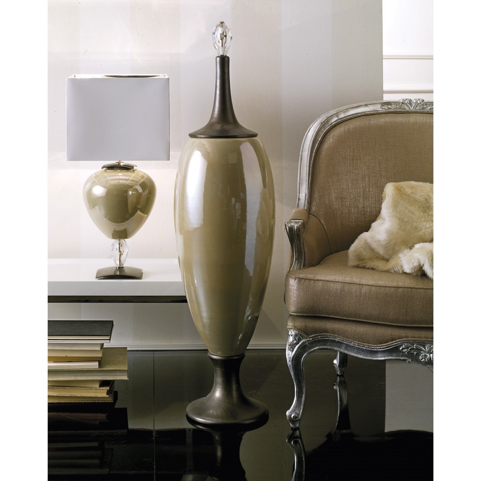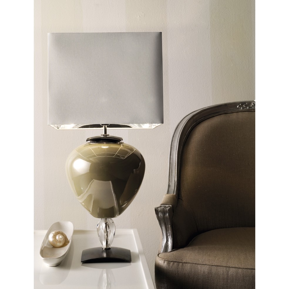 Hand glazed majolica lamp composed by base and upper part in pewter finish, chromed brass details and hand cut crystal. White chintz lampshade with silver coloured inside.