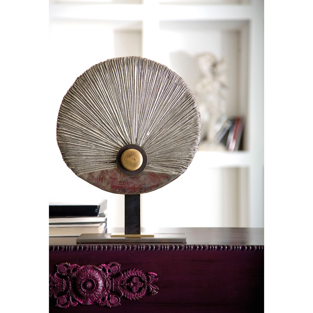 Platinum plated, hand engraved majolica object. Iron and bronze base and details.